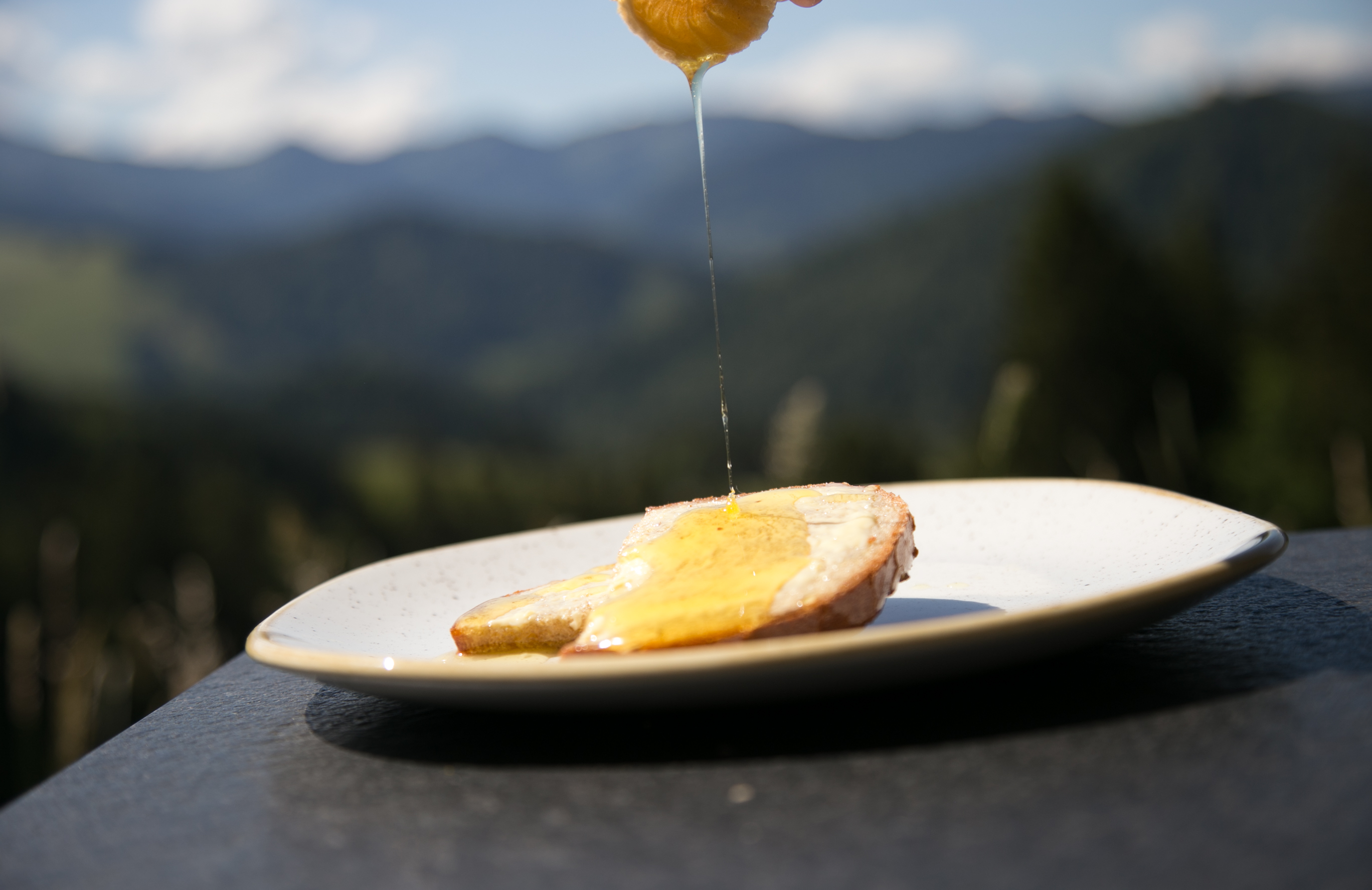 Einmal in der Woche, meist sonntags, ist die Vorfreude groß: Bergfrühstück steht auf dem Wochenprogramm in Haubers Naturresort. Bei schönem Wetter geht´s zu Fuß, mit dem E-Bike oder auf dem urigen Heuwagen und dem alten Fendttraktor hoch zum Schwalbennest. Dort wird das Bergfrühstück aufgetischt: Bio-Bergkäse vom Nachbarn und Biobauern Herz, wohlschmeckende Weißwürste vom Metzger Rehle, leckere Brotwaren vom Bäcker Rieser in Simmerberg und der Duft frisch gebackener Waffeln. Es werden knusprige Bratkartoffeln und frische Rühreier mit Speck und Kräutern zubereitet der Duft von frischem Bergkaffee zieht durch die Luft. Der aromatische Kaffee wird stets aus eigenem Quellwasser aufgebrüht. Mit etwas Glück haben Haubers Bienen schon die ersten feinen Pollen der Frühlingsblüten gesammelt und Imker Willi konnte erste Gläser von Haubers Honig abfüllen. Rund 400.000 fleißige Bienen haben ihren Platz gefunden, gleich unterhalb von Haubers Schwalbennest. Direktlieferung aufs Frühstücksbrot…oder um den feinen Kräutertee zu versüßen? Der sämige Blütenhonig in den Frühlingsmonaten wird im Sommer von waldigen Noten im Sommertracht-Gold abgelöst. Ein Hochgenuss auf 950m!