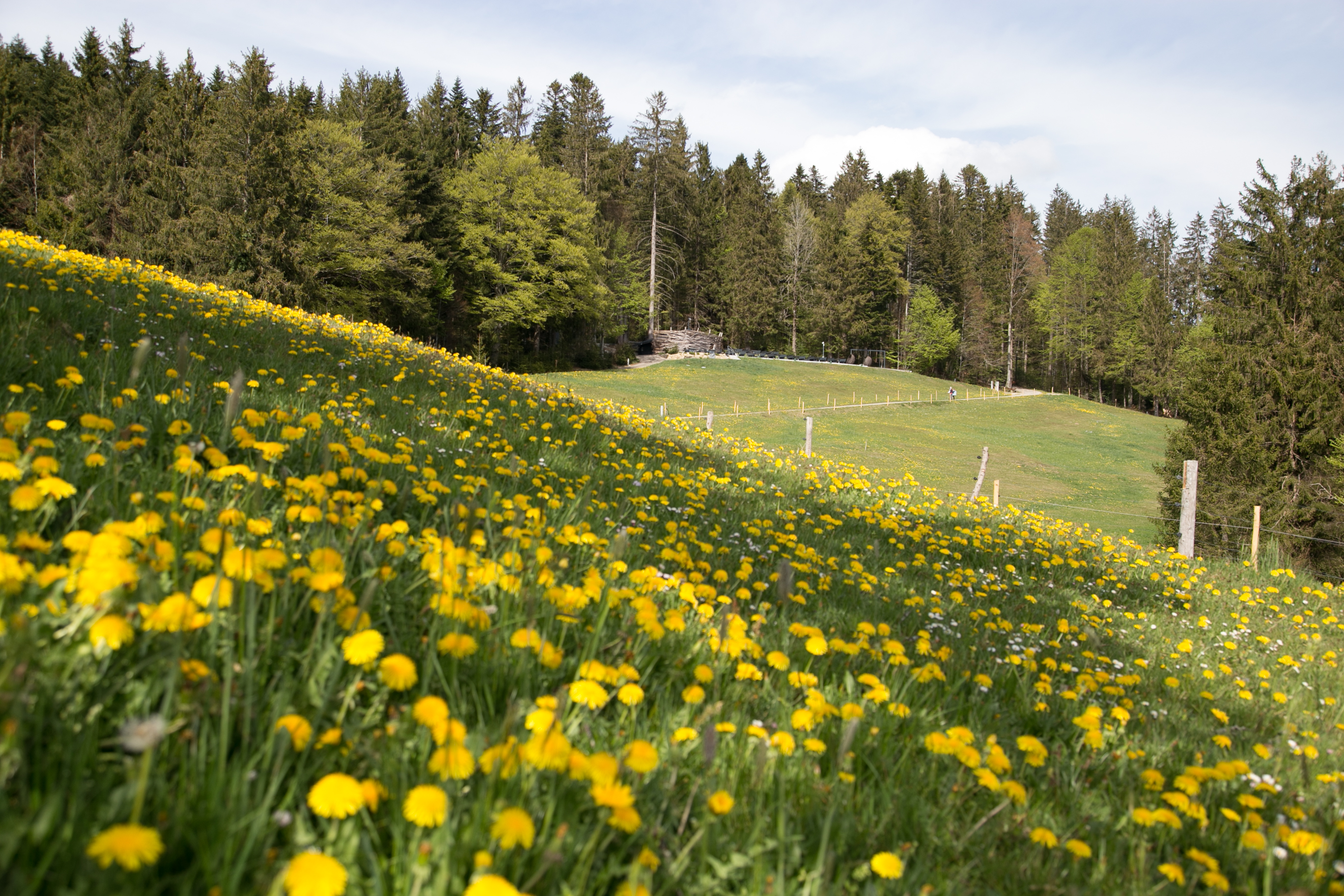 Der Frühling zieht ein in Haubers Naturresort. „Das Licht ist in dieser Zeit zu jeder Stunde anders“ schwärmt Klaus Hauber. Und leuchtet zwischen den Ästen durch auf den duftenden Waldboden. Egal ob Früh- oder Spätblüher, ob Wiese oder Wald: Die Natur zeigt in dieser Zeit an jedem Tag, dass es jetzt weiter und dass es wieder vorwärts geht. Dass die Pause zu Ende ist. „Nach dem Verharren entsteht etwas Neues. Etwas Schönes. Das Warten ist vorbei. Und die Gegenwart beginnt. Die Zeit, in der die schönste Pracht, die meisten Samen und die duftendsten ätherischen Öle sind im ersten Aufwuchs von Haubers Bergheu enthalten sind. Die Sonne im Allgäu gibt sich zu dieser Zeit größte Mühe, die Südhänge zu erwärmen: Ober- und Untergräser, Doldenblütler, der kleine Frauenmantel, Spitzwegerich, Löwenzahnblüte – alle sind sonnenhungrig und bekommen in der Zeit von Mai bis Juni Licht und Wärme zum Gedeihen.