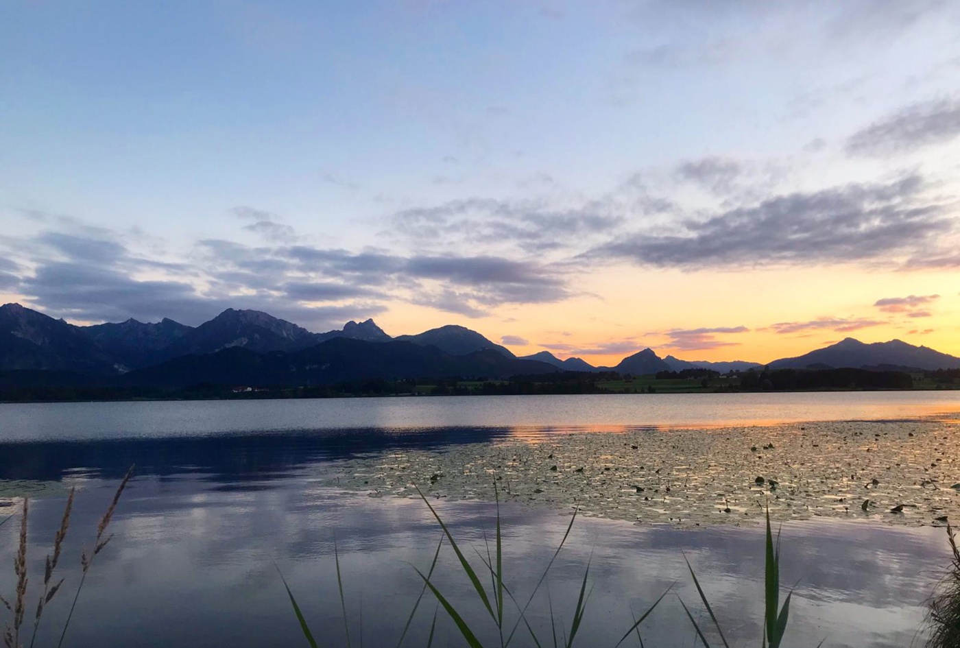 Ein ca. 30minütiger achtsamer Abend-Spaziergang ab dem Hotel zur Hopfener Burgruine – der ältesten Steinburg des Allgäus. Von hier oben hat man den schönsten Blick über das Füssener Land. Der Blick schweift über den Hopfensee, über die gesamte Bergkette der Ammergauer, Tiroler und Allgäuer Alpen bis hinüber zu den beleuchteten Schlössern Ludwigs II.. Zurück geht es am Hochmoor vorbei durch den Wald, wo einem nicht selten Eichhörnchen, allerlei Insekten und Rehe über den Weg laufen (manchmal allerdings auch das eine oder andere „Rindvieh“…).