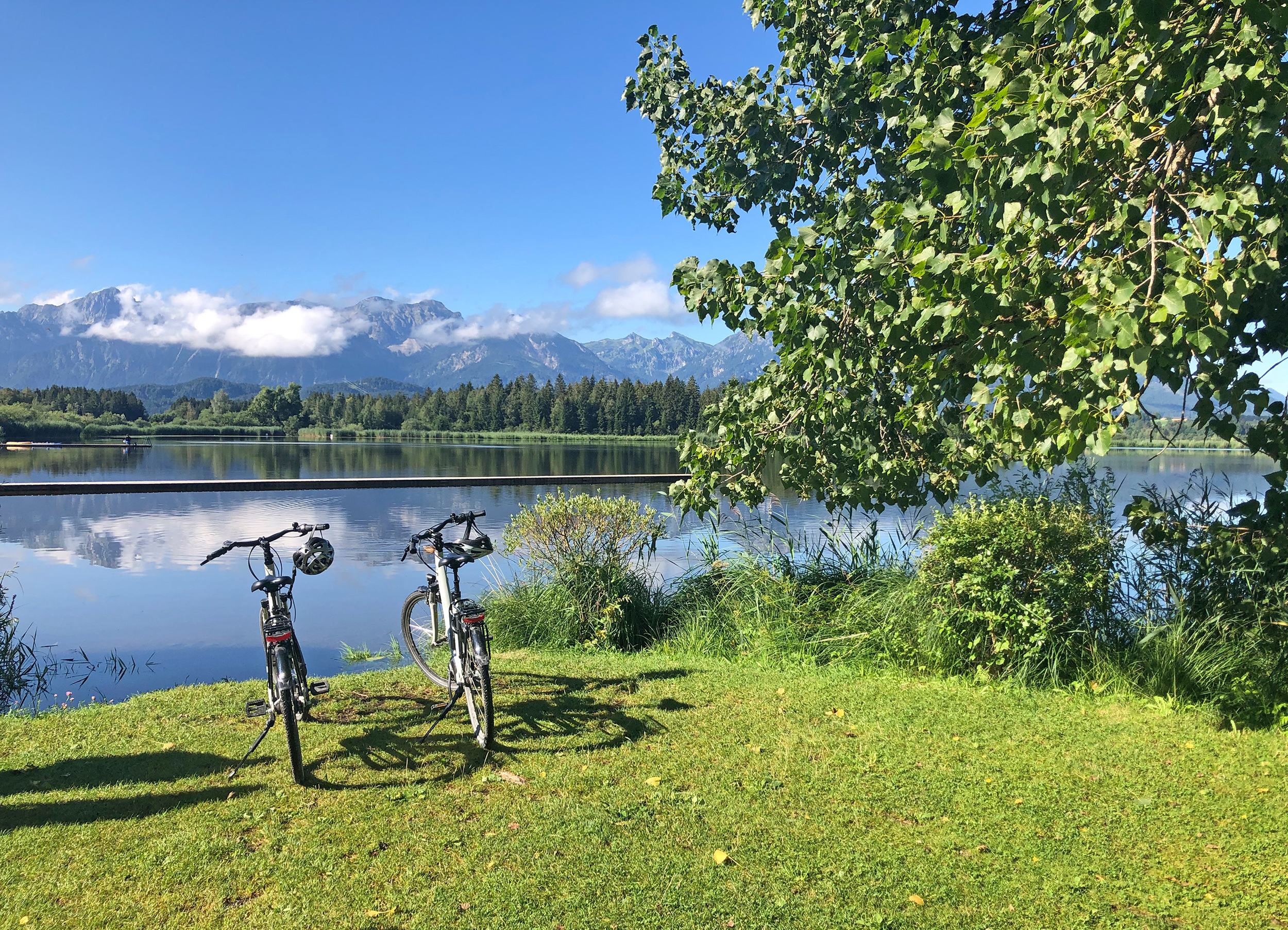 Beliebter Haltepunkt z. B. bei einer 5-Seen-Radrunde ist der Hopfensee – nur 500m Luftlinie vom Hotel entfernt. Der Hopfensee ist ein sogenannter Toteis-See, der in der Eiszeit durch die Austiefung der Zungen der Lech-Gletscher entstand. Seine Oberfläche beträgt rund 2 km², an manchen Stellen erreicht er eine Tiefe von gut 10 m. Mit einer Temperatur von 20-25 Grad Celsius zählt er zu einem der wärmsten bayerischen Vorgebirgsseen. Das leicht moorige Wasser und die seicht abfallenden Uferbereiche machen den Hopfensee zum idealen Badesee. Zu jeder Tageszeit ist der herrlich freie Blick über die Wasserfläche ein Genuss; Wo kann es schöner sein als an der „Allgäuer Riviera“, wie die Seepromenade von Hopfen am See aufgrund der klimatisch begünstigen Lage auch gerne genannt wird?