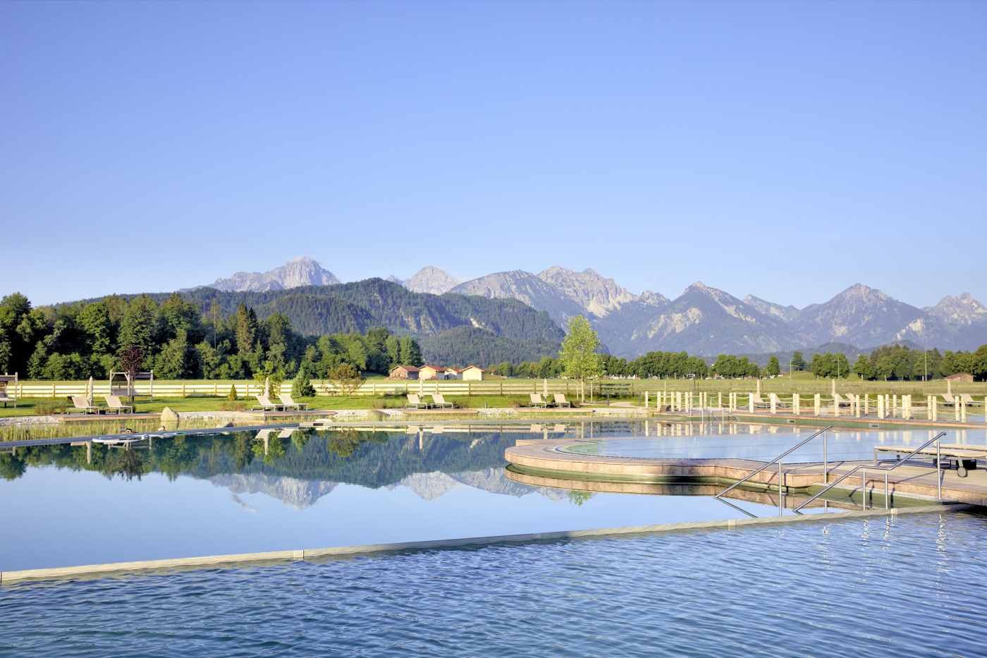 „Ein knapp ein Kilometer langer Rundweg schlängelt sich durch die ganze Anlage“, erzählt Gastgeber Florian Lingenfelder. „Der Weg führt zu verschiedene Liegeflächen am See, an unsere zwei Schwimmteiche, zu abgelegenen Plätzen mit grandiosem Bergblick und absoluter Privatheit, und im hinteren Bereich, beim Saunaschwimmteich, sogar zu einer Streuobstwiese, auf der die Liegen zwischen Allgäuer Apfelbäume verteilt sind. Hier summen die Bienen und es duftet nach den bunten Wildblumen im hohen Gras.“