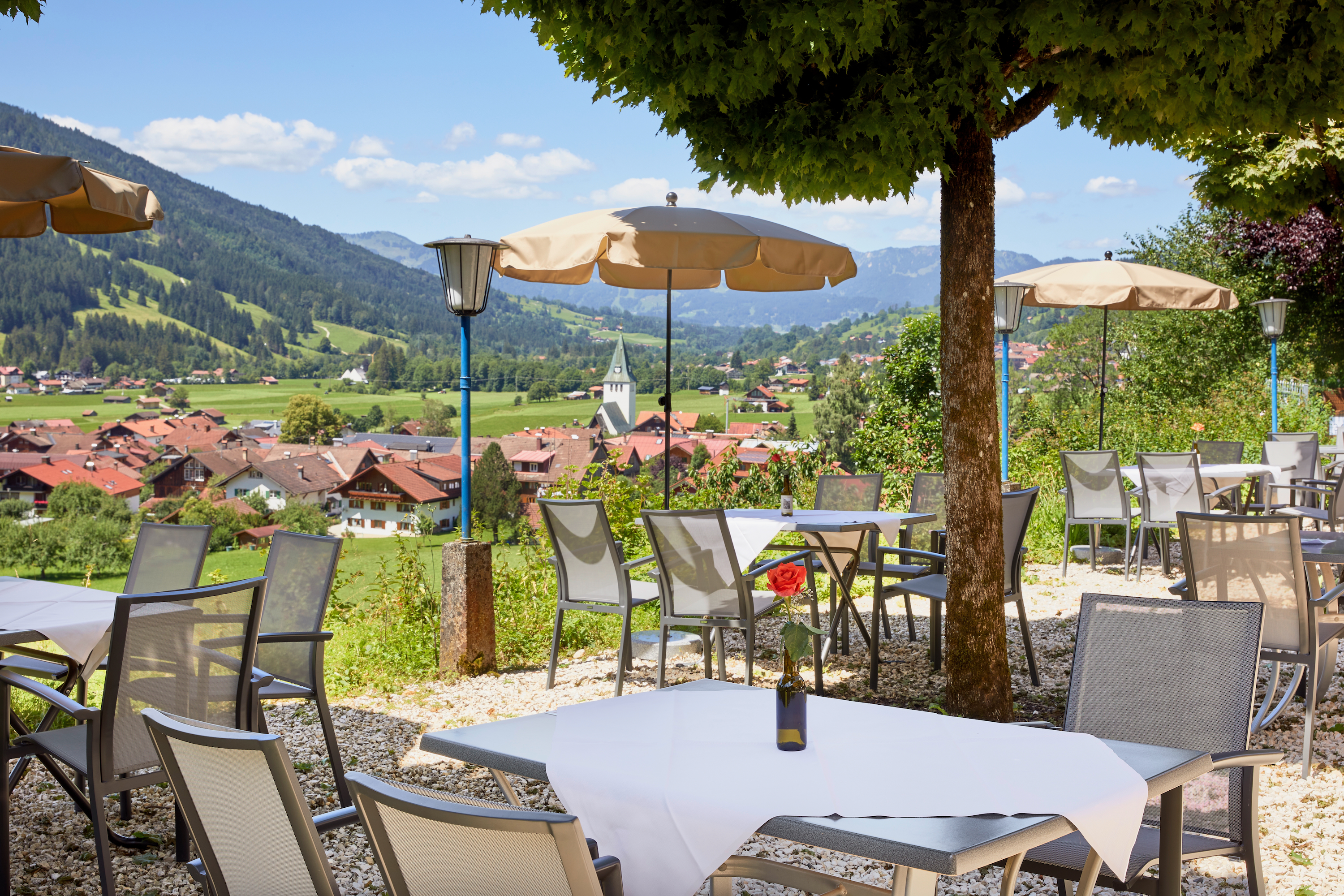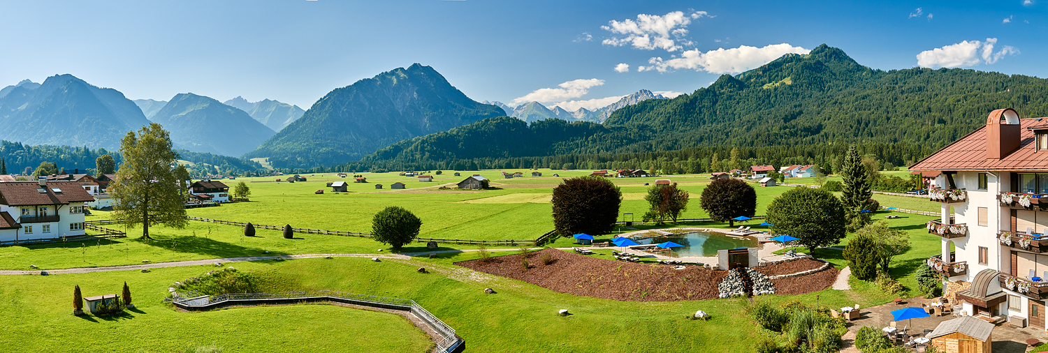 Auf 12 000 Quadratmetern lässt sich rings um das 4-Sterne-Superior-Hotel die ganze Schönheit der Natur hautnah erleben. Die Gartenanlage mit den zahlreichen, lauschigen Plätzchen zum Entspannen bietet von jedem Winkel aus einen freien Blick in die weiten Wiesen und die majestätischen Allgäuer Alpen.