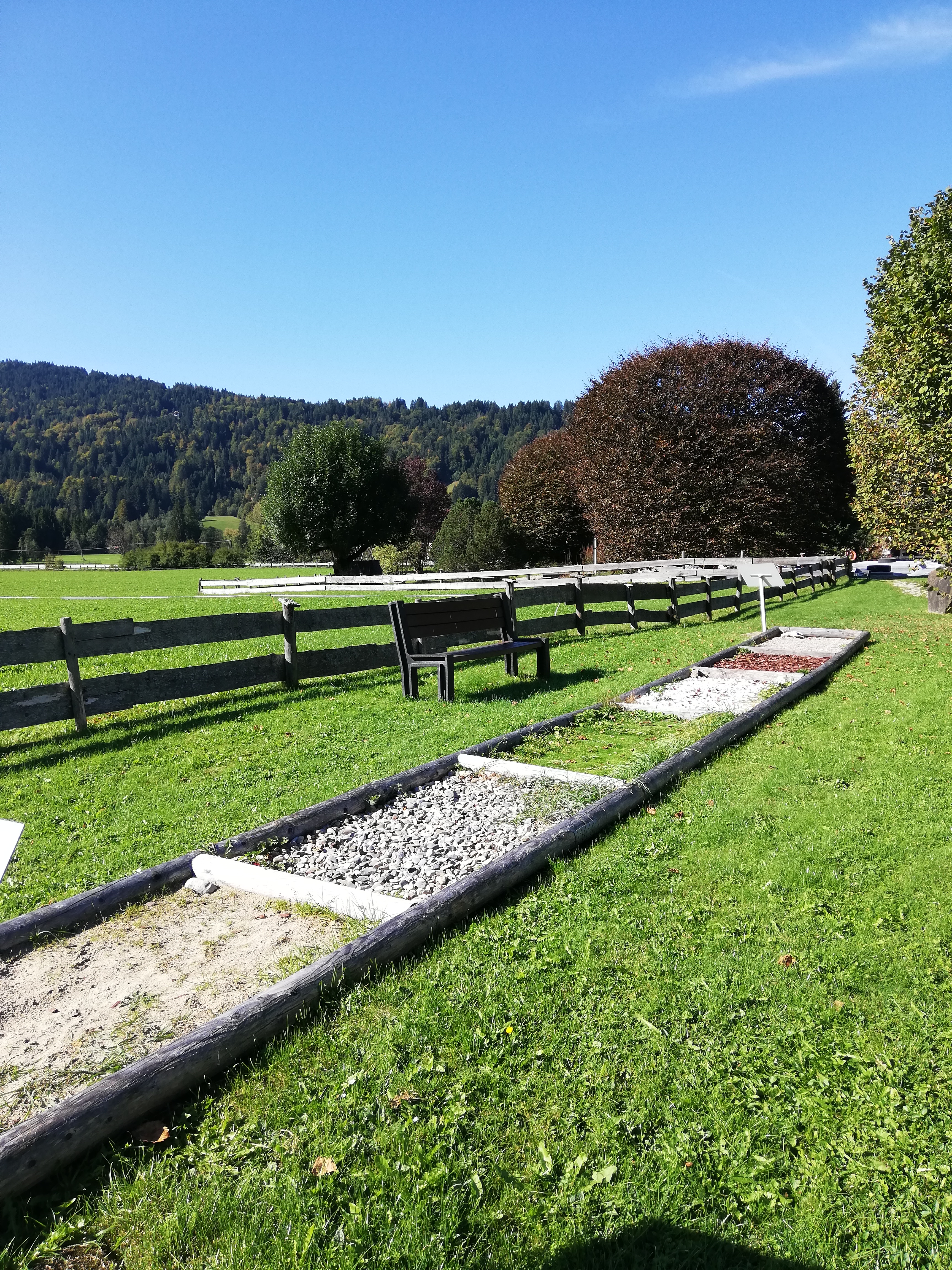 Wenn sich früh Morgens die Sonne über die scharfgezackten Gipfel schiebt, gleißendes Licht das Allgäu in warme, weiche Farben hüllt und die Vögel in den heimischen Sträuchern und Baumen zwitschern, dann ist der perfekte Zeitpunkt für einen erfrischenden Morgenspaziergang über das Areal.