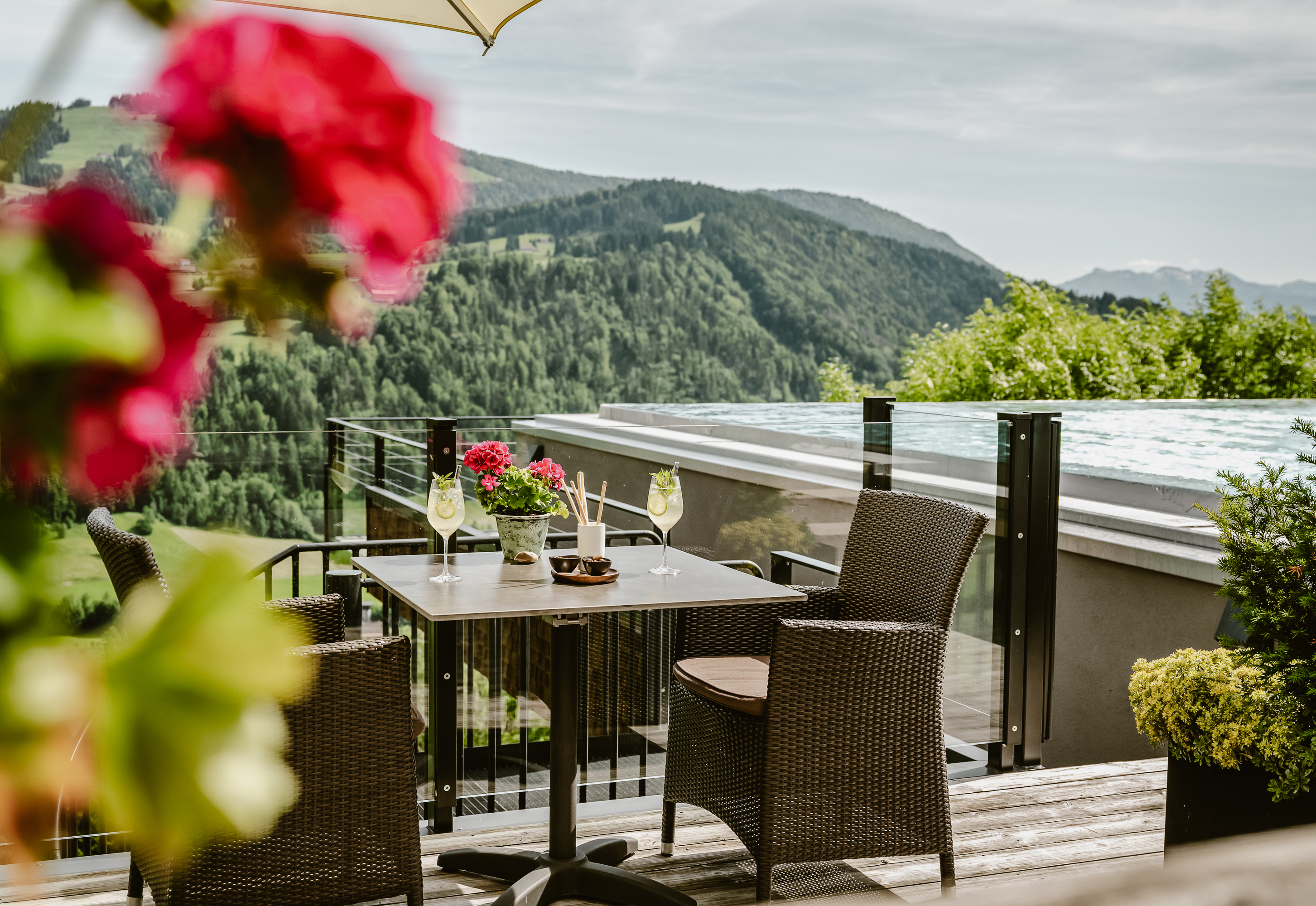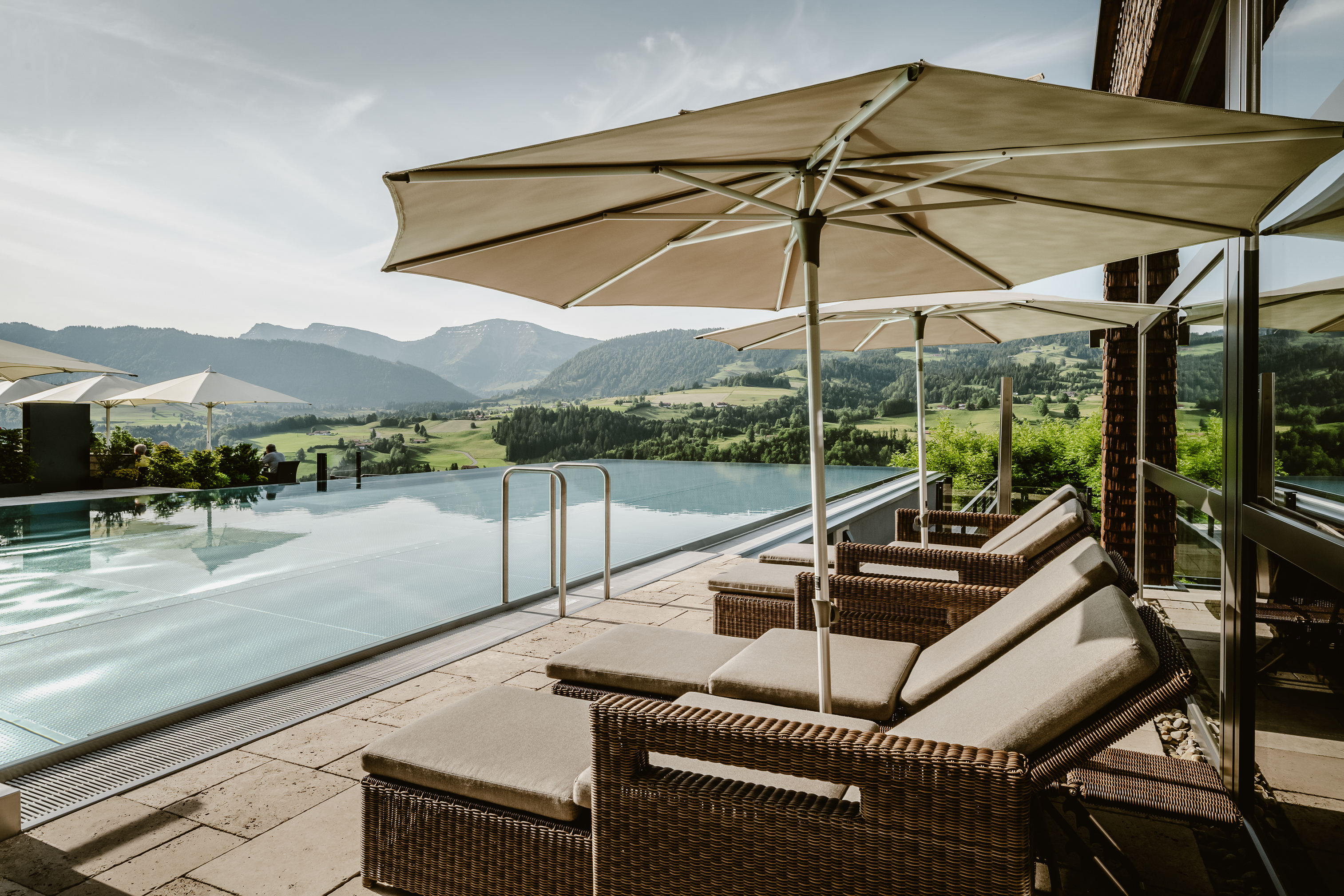 Zurück von einem unvergesslichen Naturerlebnis, genießen Sie auf der Panoramaterrasse einen erfrischenden Sommerdrink, um anschließend auf eine der Lounge-Liegen am Infinity-Pool direkt neben der Terrasse zu wechseln, und Panorama-Wellness der Extraklasse zu erleben: Schwimmen mit Endlosgefühl, Abtauchen in der Leichtigkeit und erfrischende Momente an heißen Sommertagen.