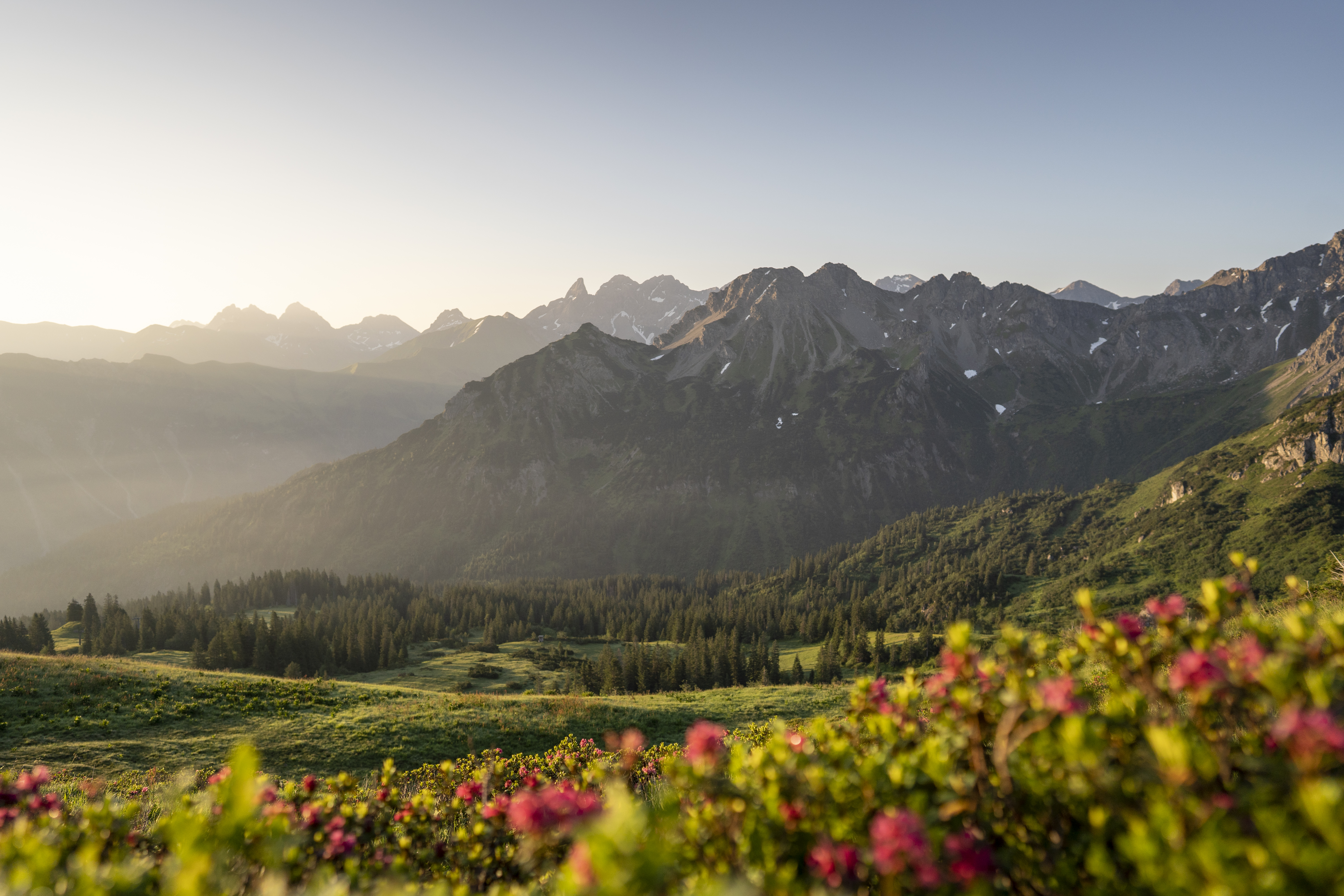 Rings um das Hotel Alpenhof lässt die Frühlingssonne die letzten Schneereste auf den hochaufragenden Gipfeln schmelzen und zaubert auf den Berghängen einzigartige Blütenmeere. Bekannt für seine Pflanzenpracht ist der nahegelegene Blumenberg Fellhorn. Im Mai und Juni blüht dort die Königin der Heidekrautgewächse, die strahlend schöne Alpenrose. Während unten im Tal der Allgäuer Frühling löwenzahn-gelb ist, leuchtet diese Jahreszeit in den Höhen pink. Dabei ist die Alpenrosenblüte vor dem tiefblauen Allgäu-Himmel nicht nur ein einzigartiger Anblick, sie erfüllt die Bergluft zudem mit ihrem blumigen Duft und weckt bei den bergbegeisterten Besuchern Frühlingsgefühle.
