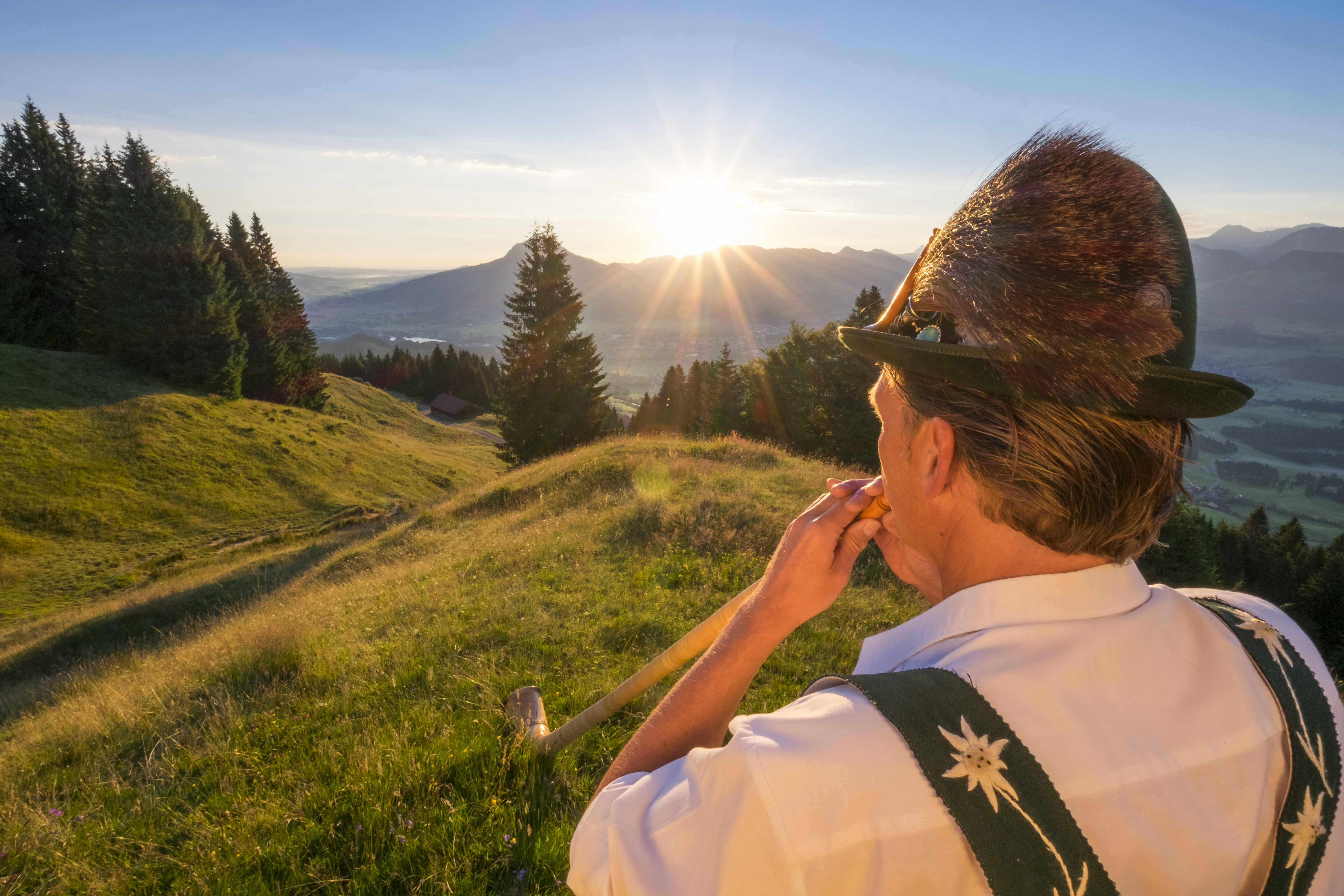Und bei der Allgäuer Volksmusik kommt Jörg, Janas Ehemann, ins Spiel. Denn der pflegt eine ganz besondere Allgäuer Tradition: das Alphornblasen. Hier oben bei den Pöschls können Gäste das Alphornblasen nicht nur hören und spüren, sondern beim Chef persönlich in der hauseigenen Alphornschule erlernen. Die ersten Kurse finden im Frühling statt, dann wird im Freien geblasen und frische Allgäuer Bergluft inhaliert. Bis weit in den Herbst hinein. Auch Tradition: Jeden Sonntag um halb Zwölf gibt’s im Landhotel Alphorn das traditionelle Weißwurst-Frühschoppen, bei dem Jörg Pöschl Herkunft und Tradition dieses einzigartigen Alpenländischen Brauchtums erklärt.