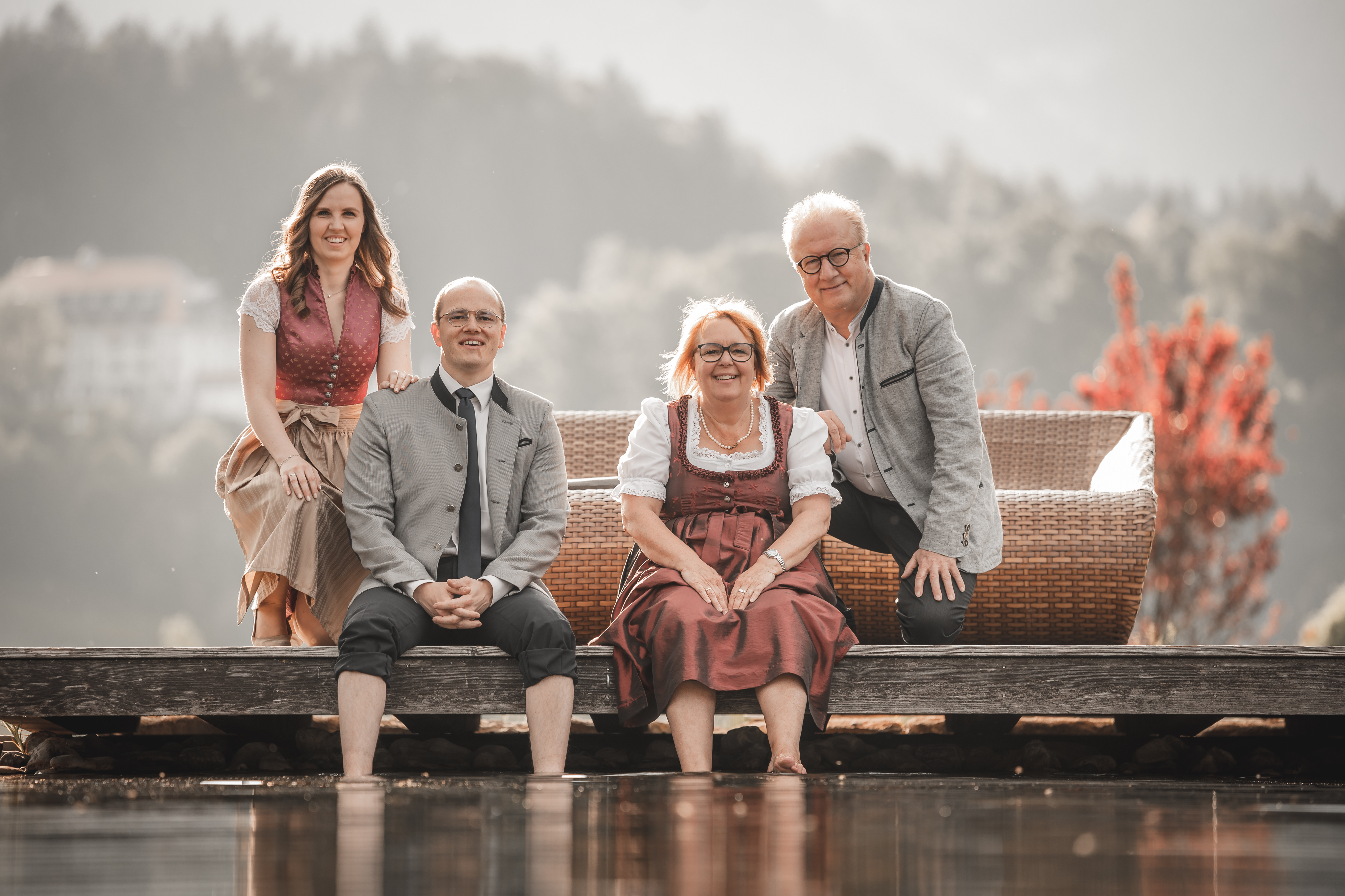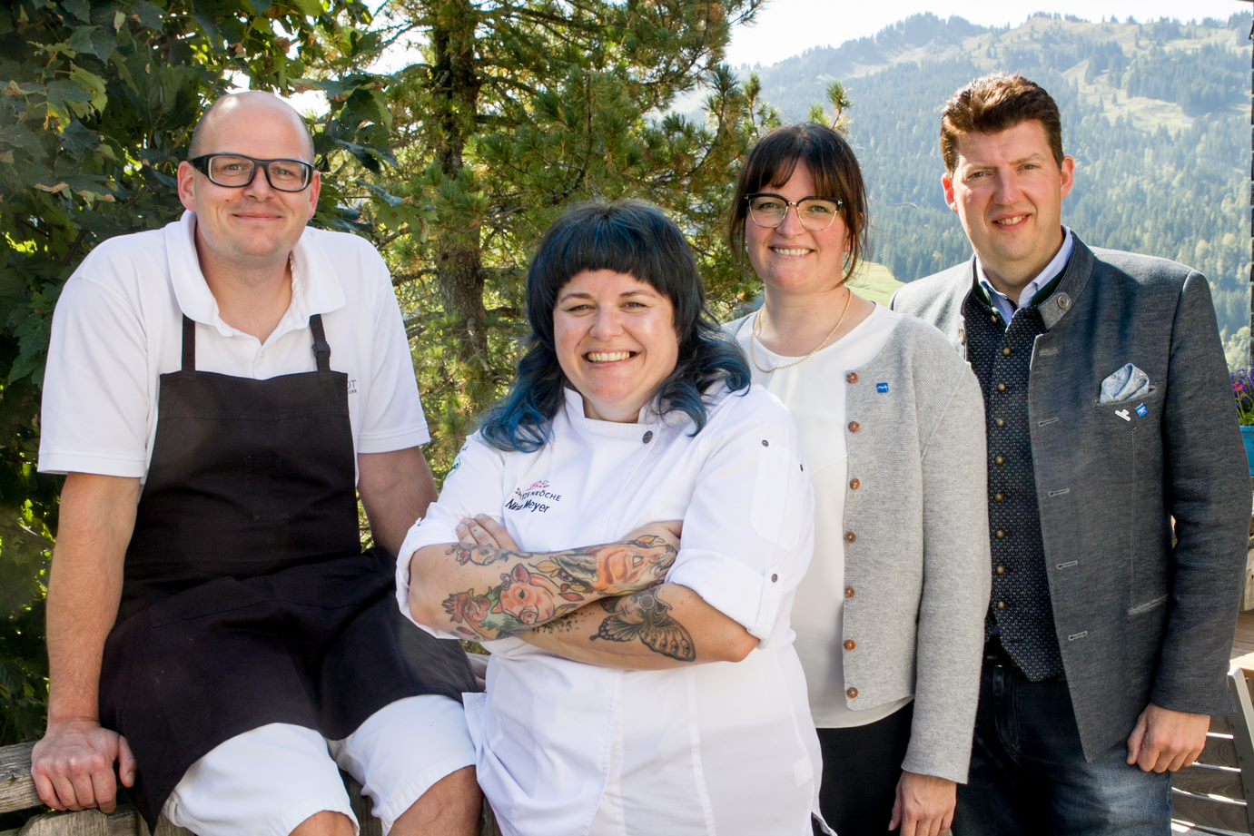 Bianca Schießl (2. von rechts) liebt die Traditionen. Aber genauso die Moderne. Eben baut sie das komplette Hotel um – inklusive nagelneuer Lobby, nach hinten-oben gestaffeltem Wellnessbereich und erweitertem Restaurant. Apropos Restaurant: Bei den Schießls kommt nur Bio auf den Tisch. Bianca geht den Weg ihrer Eltern konsequent weiter und machte 2014 das Hotel zum Bio-Hotel. „Wir legen großen Wert auf Regionalität“, sagt die Chefin. „Seit Anfang der 2000er Jahre verarbeiten wir ganze Tiere von Bauern, die wir kennen.“ Stichwort: nose to tail. Bianca ist in dritter Generation Hotelier, ihre Schwester Nina sogar schon in vierter Generation Köchin. Sie hat eine einfache Gleichung: zwei Drittel Klassiker der alpinen Küche plus ein Drittel exzentrische Fusion aus Allgäuer Gerichten, fremden Zutaten und Zubereitungsarten ist gleich hundert Prozent Geschmack und Gesundheit.