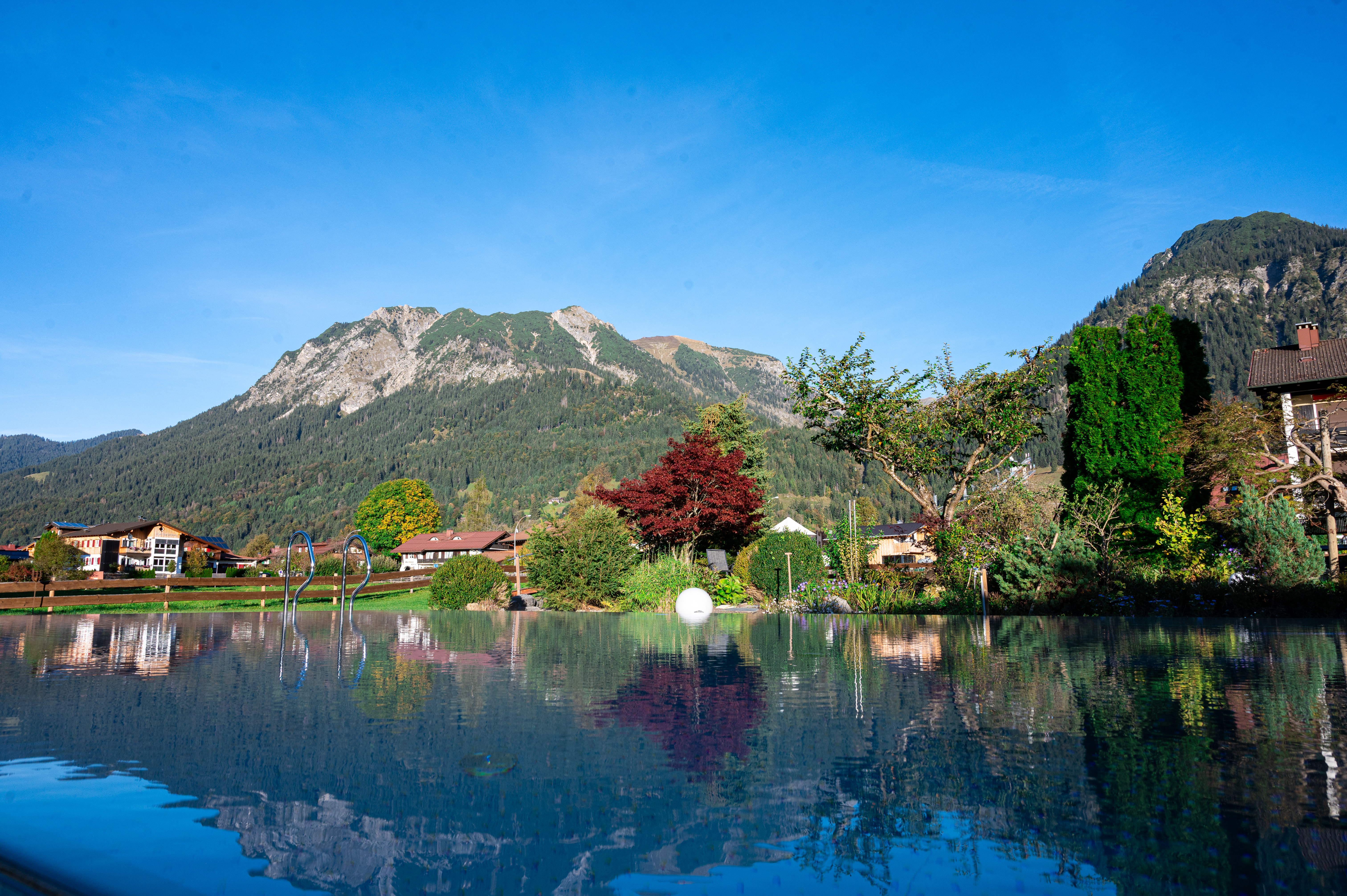 Nach dem Sauna-Gang heißt es: nach draußen gehen und tief ein- und ausatmen. Eine herrliche Erfrischung verspricht der Natur-Schwimm-Pool, nicht beheizt und so kühl wie der Hopfensee zu Füßen des Hotels. Je nach Außentemperatur sonnt man sich noch draußen oder legt sich auf eine bequeme Liege aus Zirbenholz im „Raum der Stille“, wo der Steinbrunnen leise vor sich hinplätschert. Ob hier, im Bergblick-Ruheraum oder in einer der kuscheligen Nischen, ob mit Tee oder Buch – alles ist so entspannt.