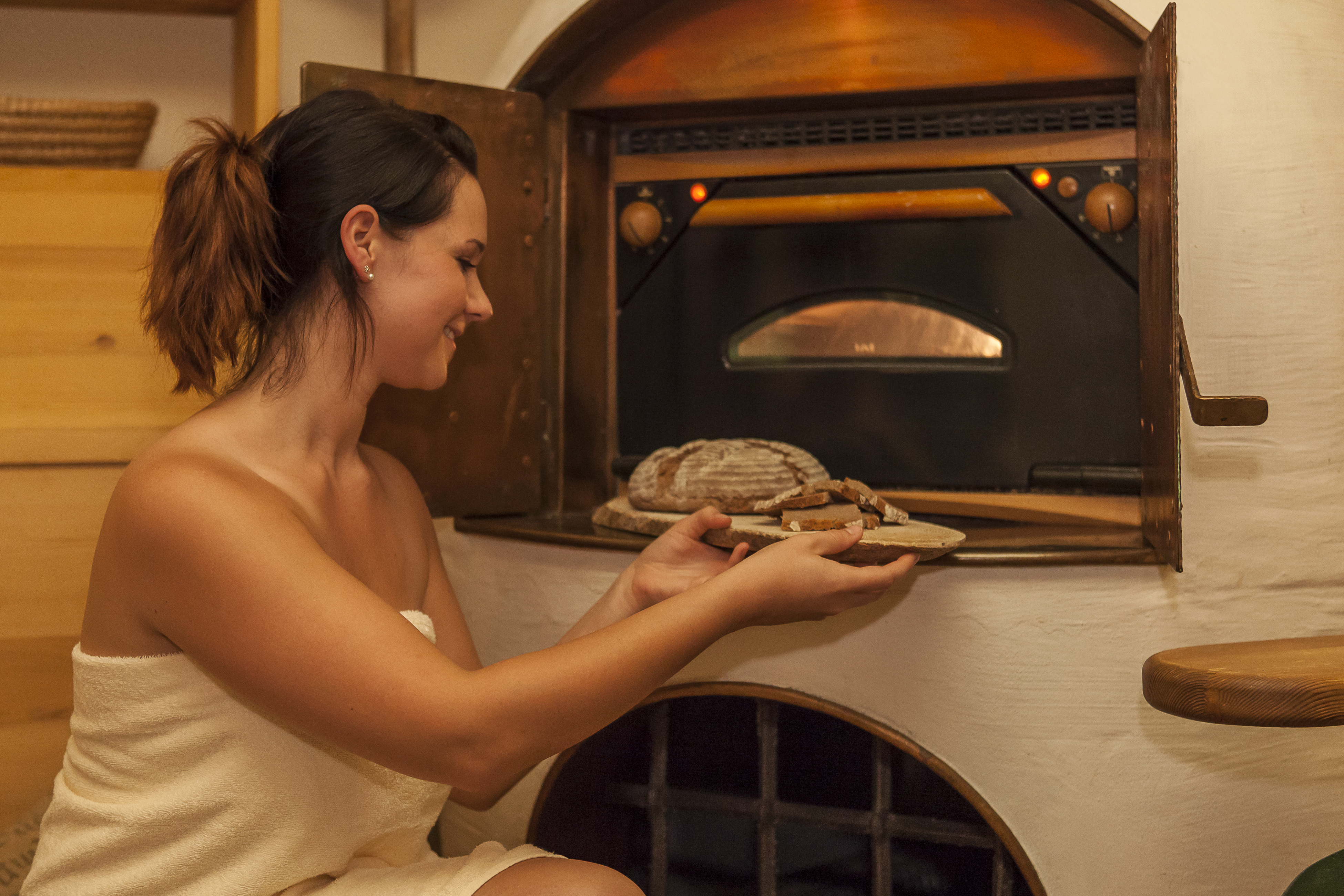 „Wir bieten schon lange das sanfte Saunieren an, das besser für Körper, Kreislauf und Muskulatur ist“, erzählt mir Hoteldirektorin Magdalena Sturm. Sie öffnet die erste Sauna-Tür, wir schauen in „Omas Backstüble“. Da habe ich mich wohl verhört, oder? Magdalena Sturm lacht: „Der Ofen in der Mitte wird auf 200 Grad aufgeheizt. Dort hinein kommt ein Sauerteigbrot, das langsam aufbackt. Dadurch werden Enzyme freigesetzt, die den Stoffwechsel anregen. Der Ofen gibt angenehme 50 Grad ab.“ Frischer Brotduft erfüllt die Luft, der Laib wird später am Wellness-Vital-Buffet verkostet.