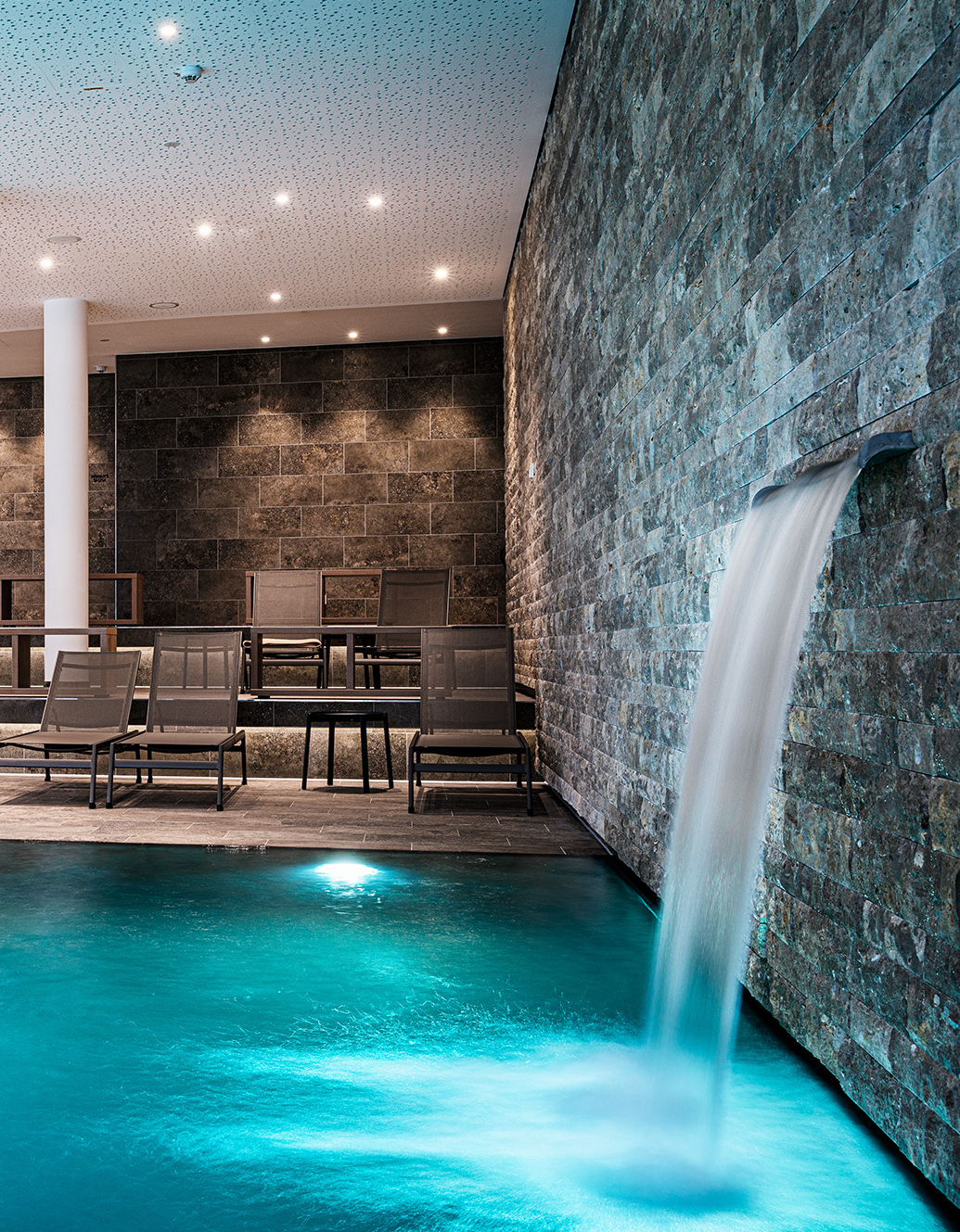 An der Spa-Rezeption sitzt Lea. Sie hat gerade ihren Kurs „Aqua Fit“ im Indoor-Pool beendet, wo der Wasserfall weiter ins Becken rauscht. „Eine Stunde mit Musik, das mögen unsere Gäste, auch wenn es anstrengend sein kann. Aber es macht Spaß“, lacht die Fitnesstrainerin. Ebenso beliebt sind Pilates- und Yoga-Kurse, wie auch der Fitnessraum – 24 Stunden geöffnet, wird er auch fast zu jeder Tages- und Nachtzeit genutzt. Ganz besonders kann man sich mit der „4 elements massage“ verwöhnen lassen. Jedes der vier Elemente hat seine speziellen Öle, Kräuter und Düfte, die mit fließenden Bewegungen in die Haut eingearbeitet werden.