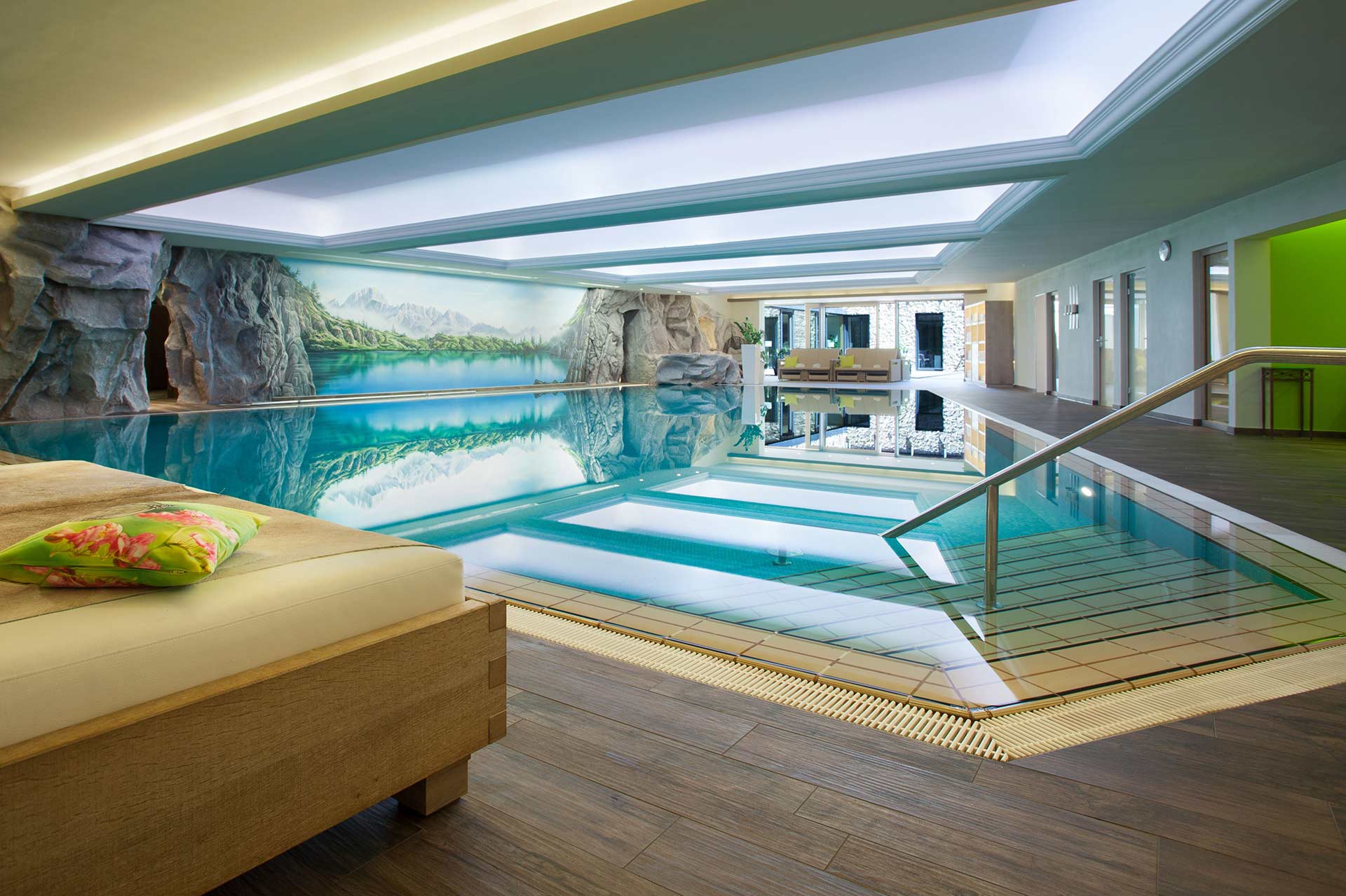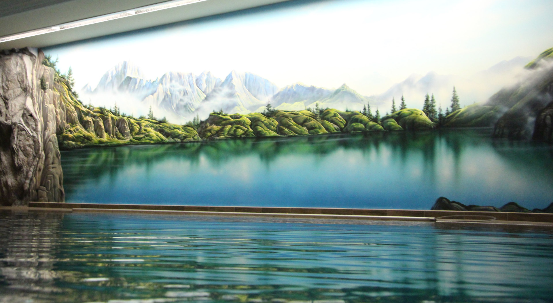 „Eintauchen“ steht auf der Tür zum Schwimmbad. Dahinter verschlägt es mir kurz den Atem: Ein riesiges Becken ist an… nein in… nein vor einem Wandgemälde platziert, das aussieht wie ein Bergsee. Steinige Felsen an den Ufern rechts und links ragen in den Raum, zum Teil sogar über das Wasser. Wer im Becken ist denkt, er schwimmt im Bergquellwasser. „Irre“, entfährt es mir.