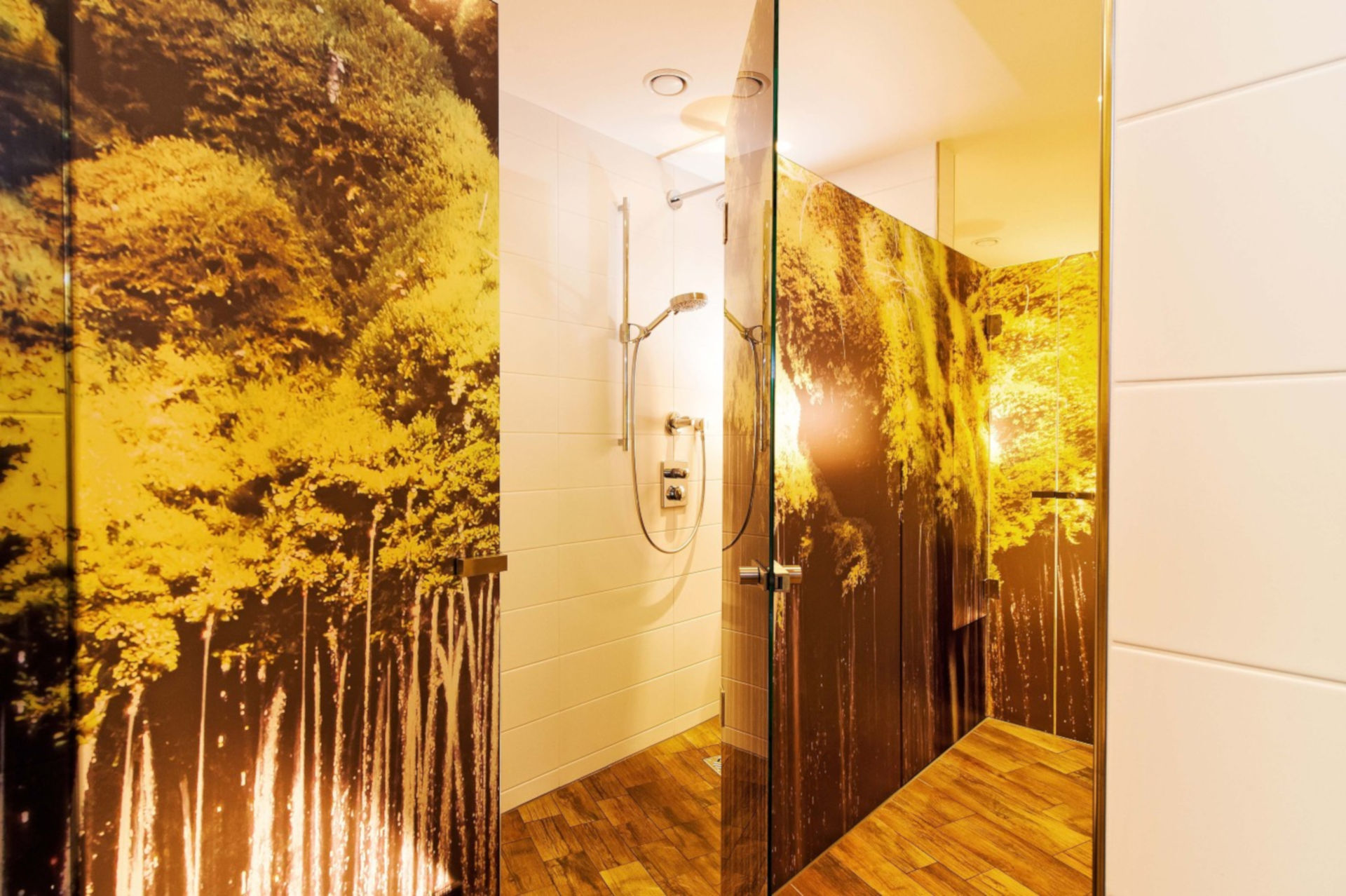Als ich mich gerade in Gedanken in die hellgrüne Ruhe-Ecke in der Wand hineinträume, höre ich ein freundliches „Frau Böck?“ Cora Bethke-Frank lächelt mich an. „Ja?“, frage ich. „Wollten Sie nicht ins Wasser?“ Ach so… doch natürlich. Die Ecke sah so einladend aus. Aber selbstverständlich will ich in dieses Becken. Ich mache mich auf in die Dusche mit den Wänden in Waldoptik, raffiniert integriert direkt in die Seitenwände des Schwimmbads. Was mich besonders freut: Überall Regale mit Handtüchern. Ein Traum. Ich muss nicht nass durch das ganze Schwimmbad laufen, sondern kann einfach zugreifen. Luxus ist manchmal ganz einfach.