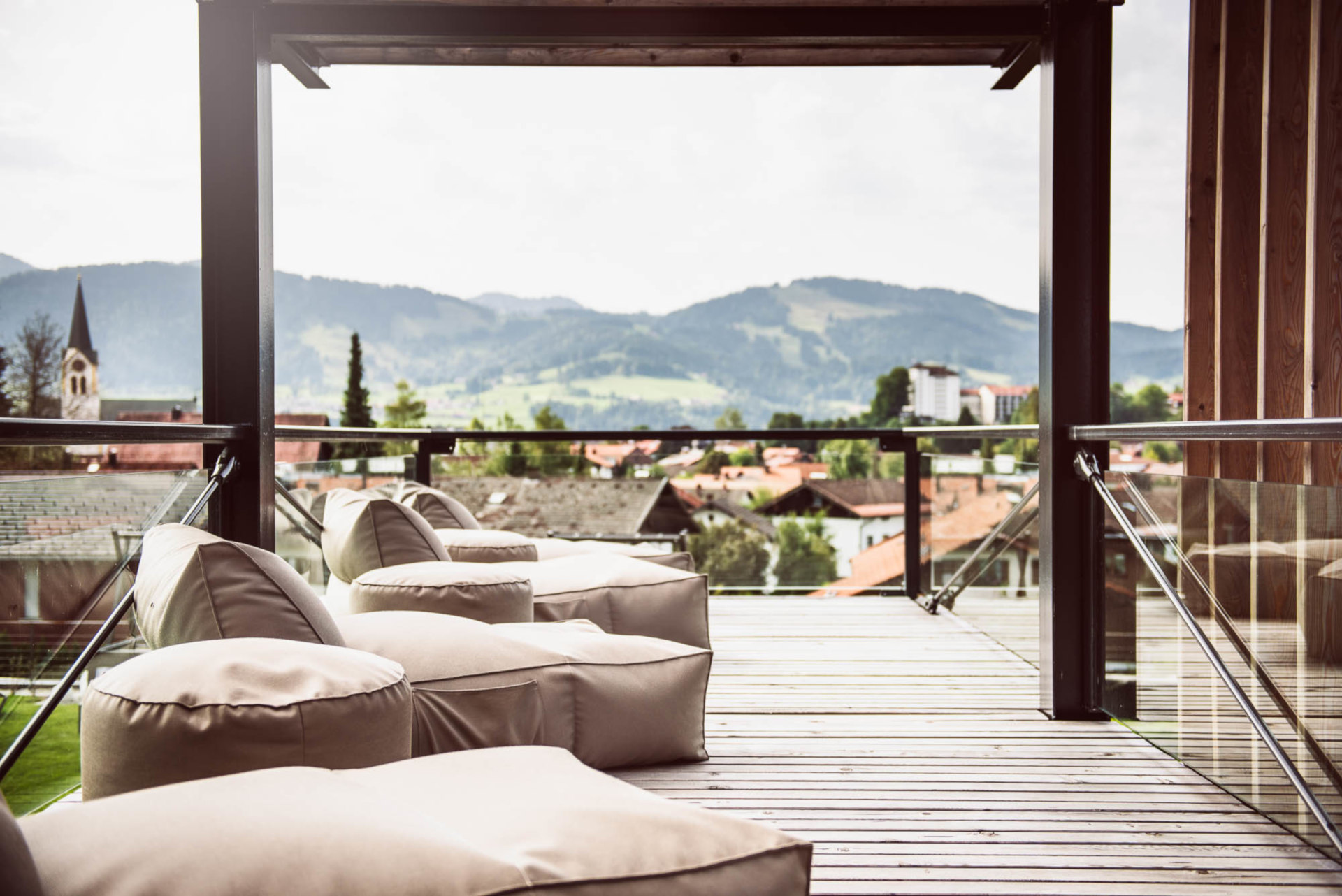 Wahnsinn: Ein XXL-Panorama, dass es einem den Atem verschlägt. Ein riesiges, spiegelglattes Infinity Becken mit Schleuse zum Außenpool. Liegen auf zwei Stockwerken: Unten in gemütlichen Nischen direkt am Wasser, auf der Galerie mit weitem Blick vorbei an Oberstaufens Kirchturm bis zu den Gipfeln der Alpen. Das Ambiente: schnörkellos, hochwertig, elegant und wohnlich. „Der Ort zum Wohlfühlen“ steht im Hauskatalog gleich auf der ersten Seite. Wie treffend…