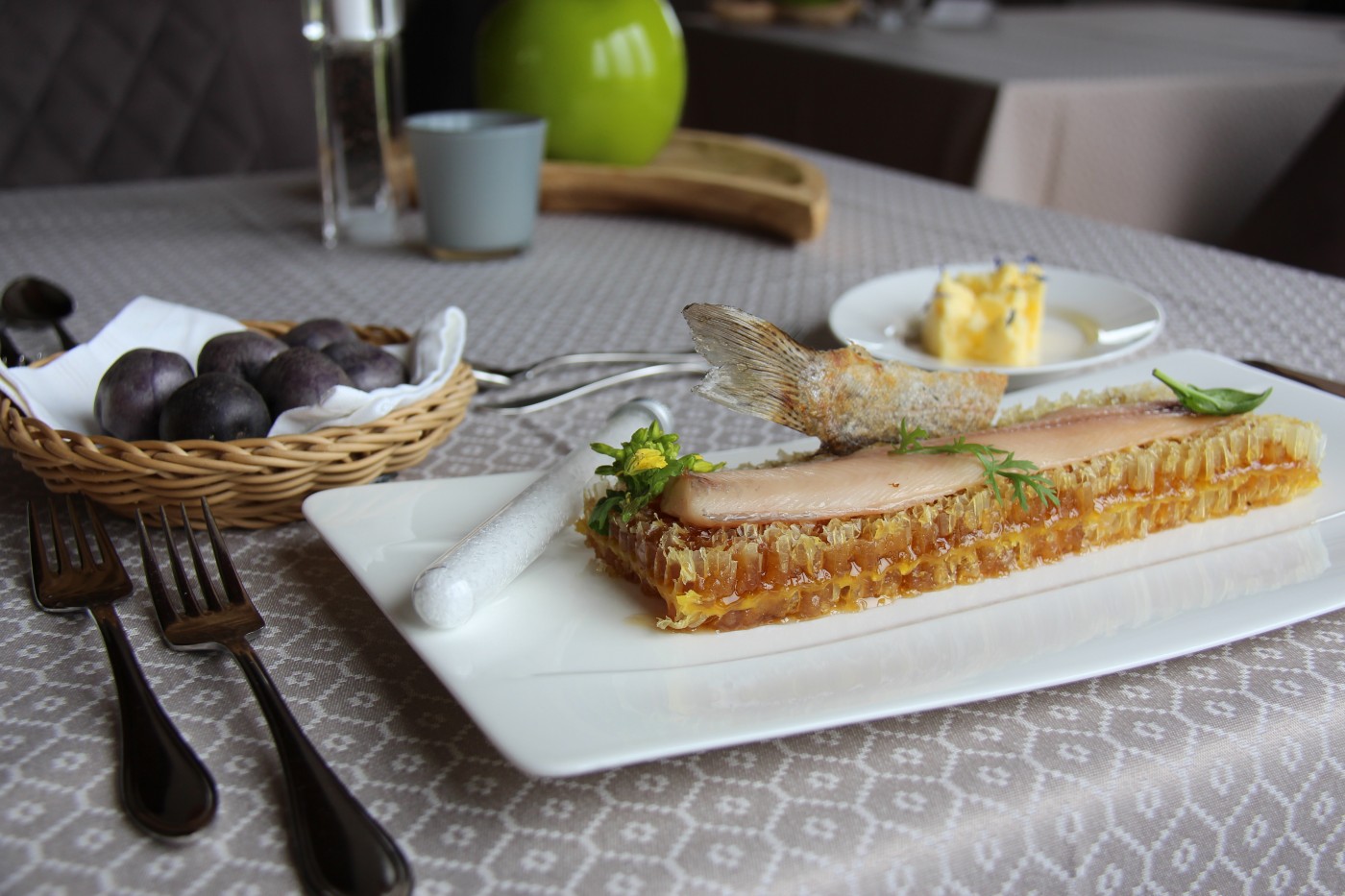 „Wir schleudern die Wabe von Hand, so dass noch etwas Honig in den Zwischenräumen bleibt“, erklärt Hobbyimker Markus Rainalter, der mit seinen beiden Brüdern das Hotel leitet. Was im Ofen aufsteigt, ist eine Mischung aus Wachsduft und süßlich-herben Aromen des Blütenhonigs. Auf dem Teller kommt die ungewöhnliche Kombination schlicht und raffiniert daher: Unten ein goldgelbes Honigbett, oben eine Forelle, die saftiger und geschmackvoller nicht sein könnte. Auch ohne die Salzflocken aus dem beigelegten Reagenzglas ist das Essen ein Gedicht: Die Fasern zerfallen auf der Zunge.