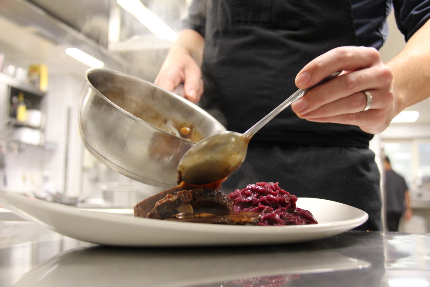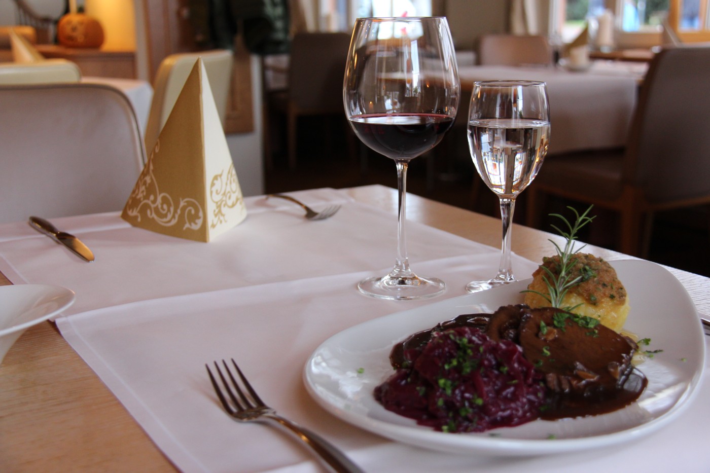 So kommen viele extra wegen dem Sauerbraten ins Haus. „Oft haben die Mutter oder die Oma dieses Gericht noch gemacht.“ Mit viel Liebe und einer großen Portion Geduld. Plötzlich hab‘ ich’s. Beim Betrachten der perfekt bestückten Gabel fällt mir endlich ein, nach was der Sauerbraten im Restaurant des Hotels Mohren in Oberstdorf schmeckt: nach wohlig warmer Geborgenheit. Oder ganz einfach: nach purem Glück.