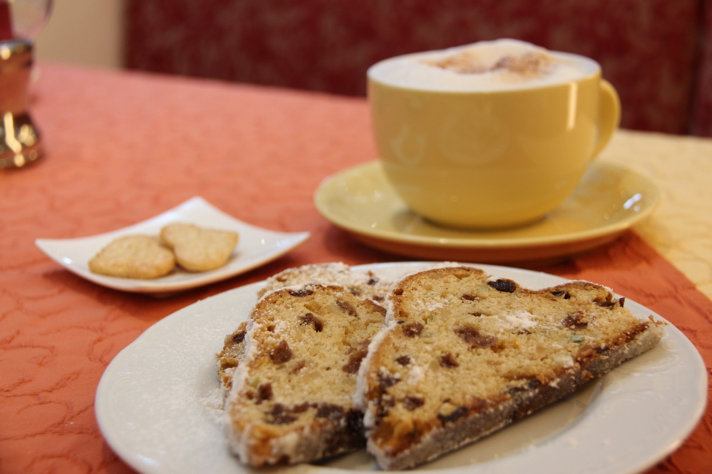 Alternativ entscheidet er sich in der Vorweihnachtszeit manchmal noch für Christstollen. Auch der ist ein Gedicht: Unter einer dicken Schicht Puderzucker verbirgt sich ein knusperiger, in Butter getränkter, leicht karamellisierter Rand. Innen ein lockerer Teig gespickt mit kleinen Stückchen in Rum eingelegter Früchte. „Den servieren wir auch zum Frühstück.“ Den Gästen schmeckt’s in der hübschen Himmelsstube offensichtlich zu jeder Tageszeit. Ein kleines Schieferherz in der Konditorei verrät warum: „Mit Liebe gemacht“ steht da drauf. Das spürt man nicht nur. Das schmeckt man hier auch…