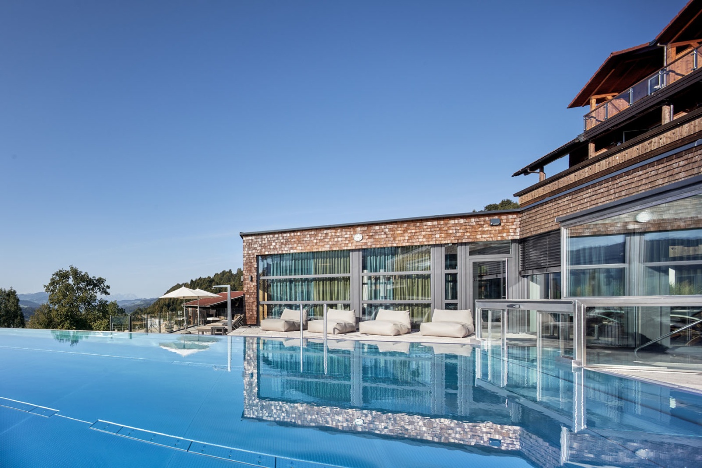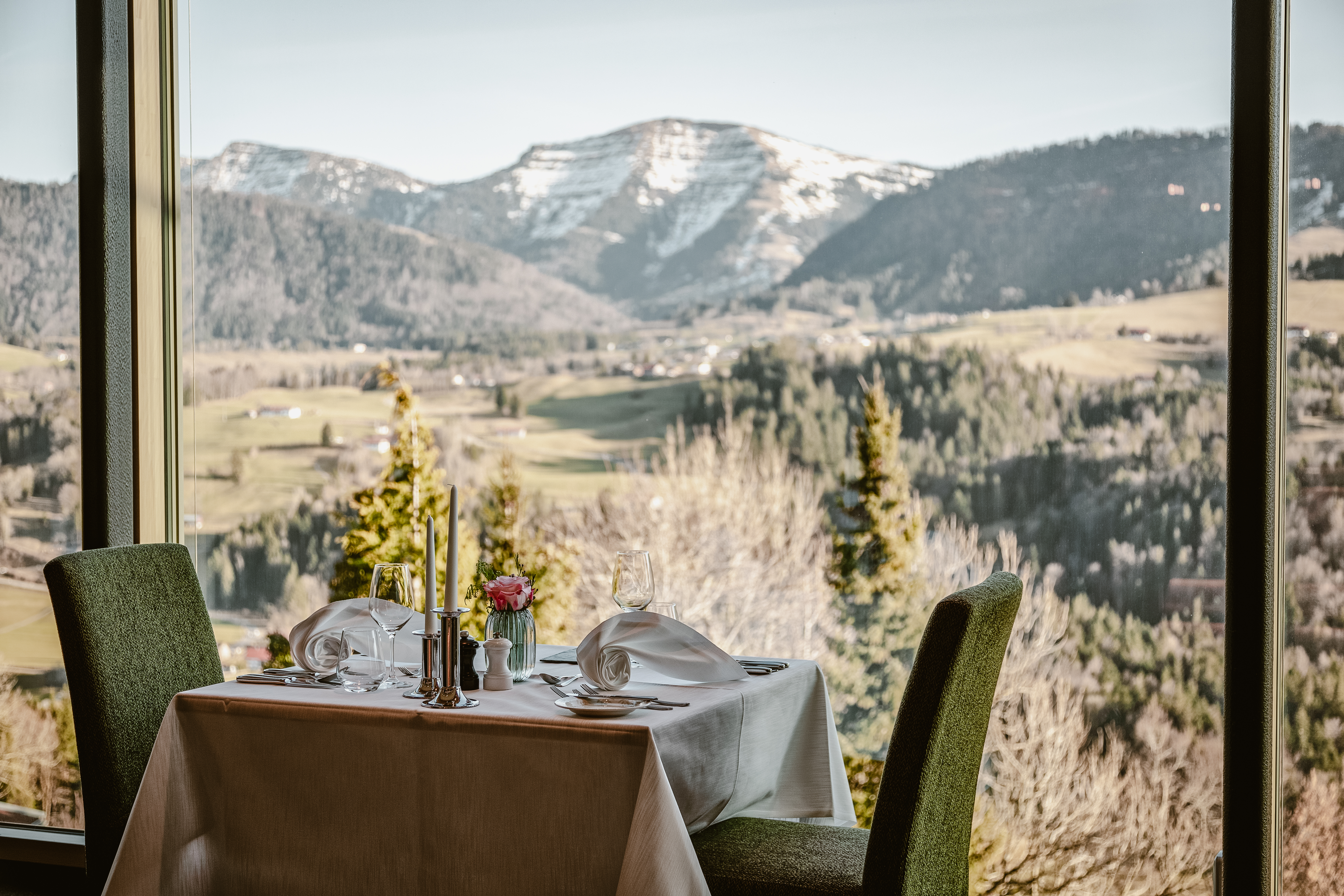 Vor uns: die ganze Pracht des Allgäus. Wiesen, Gipfel, Wald und Täler. Es ist still. Man hört nur die Natur. „Unsere Lage ist perfekt“, freut sich der Juniorchef, der das Vier-Sterne-Superior-Hotel seit zwei Jahren mit seinem Bruder Thomas (30) führt.