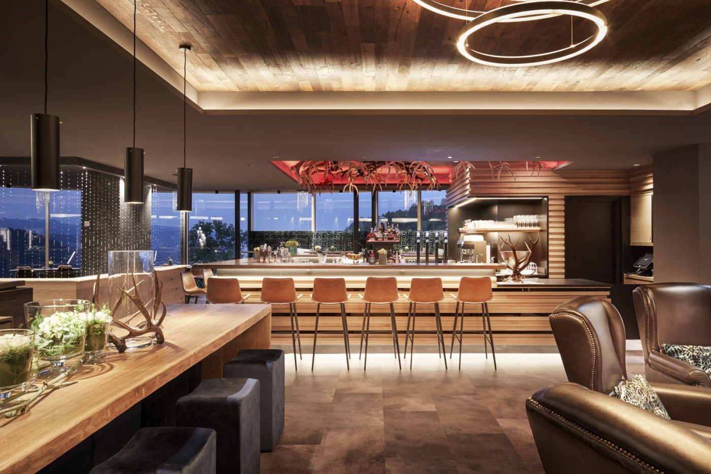 „Ich hab schon mit zwölf immer die Frühstückseier gemacht“, erzählt Johannes von seiner bis heute ungebremsten Gastfreundschaft. Früh mischte er bei den Getränken an den Theken mit. Vor ein paar Jahren konzipierte der ausgebildete Barkeeper und Barista-Experte das Herzstück des Hotels: die Hansibar. Mit original Geweihen und einen originellen Lichtprogramm.