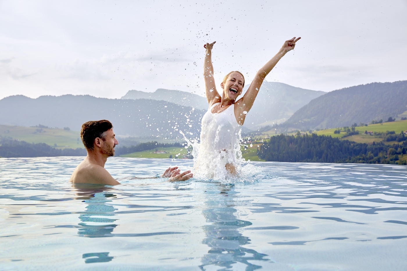 Einzigartig auch der Moment nach dem Sprung in den weitläufigen Bergkristall-Infinity-Pool, der bis in die alpine Bergwelt zu reichen scheint, wenn Sie aus dem kühlen Nass auftauchen und sich wie frisch geboren fühlen.