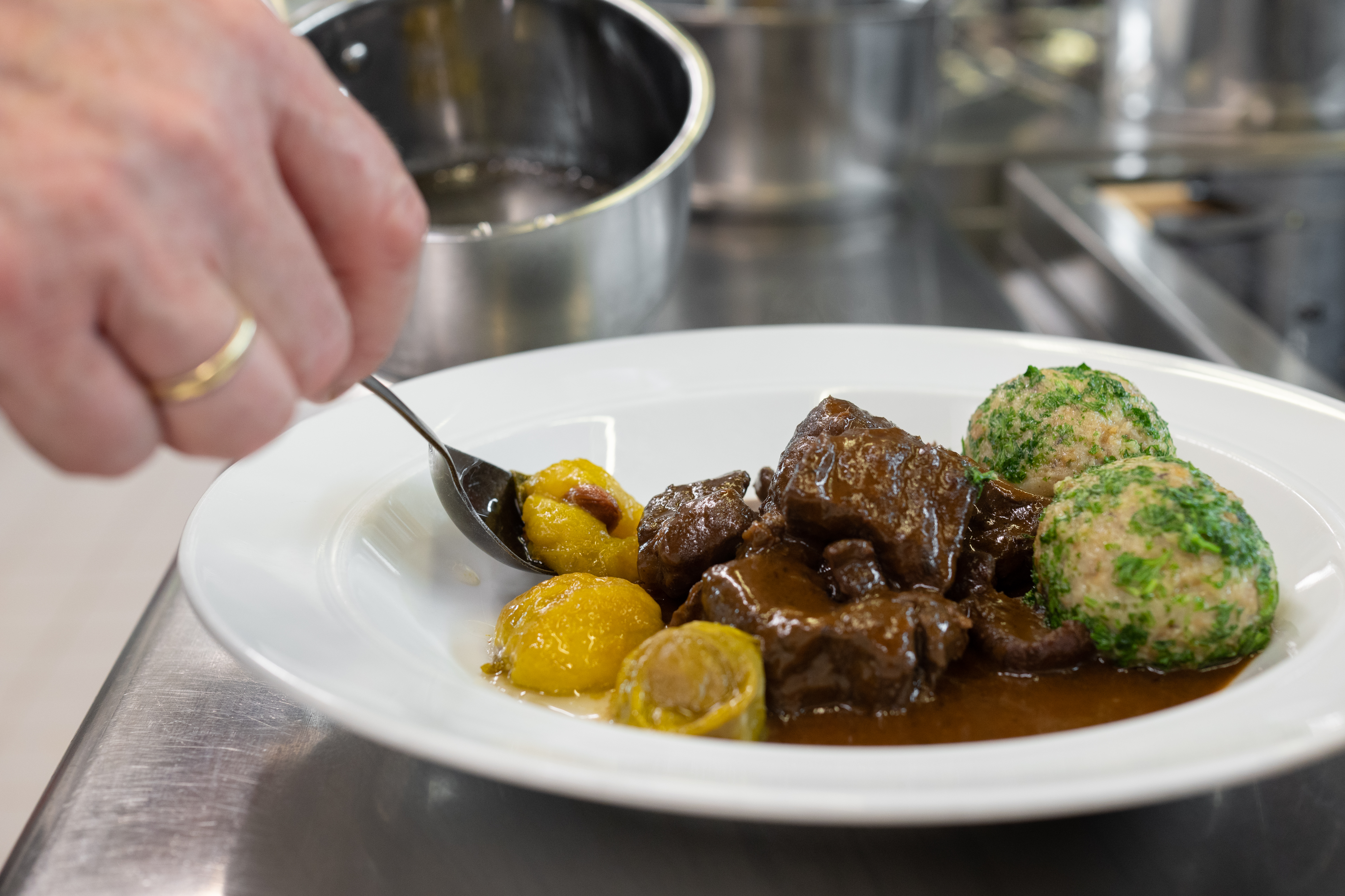 „Unsere Gäste kommen, weil es hier eben nicht immer alles gibt. “ Dabei gibt es noch genug: Schweinsbraten, Biergoulasch und Wildbratwurst kommen absolut frisch auf den Tisch von handverlesenen Lieferanten. Bei den Kompositionen auf den Tellern geht es in mancher Hinsicht auf einem sehr hohen Niveau stark in die Tiefe: Egal ob Schmorbraten oder Biergoulasch, Wildfleischpflänzle oder Käs-Knödel auf Kohlrabi in Creme – für die Gerichte im Jagdhaus recherchiert Ludger Fetz alte Rezepte oder probiert so lange aus, bis er ein exotisches Aroma durch ein ursprüngliches Lebensmittel ersetzen kann – oft mit einem besonders schmackhaften Ergebnis.