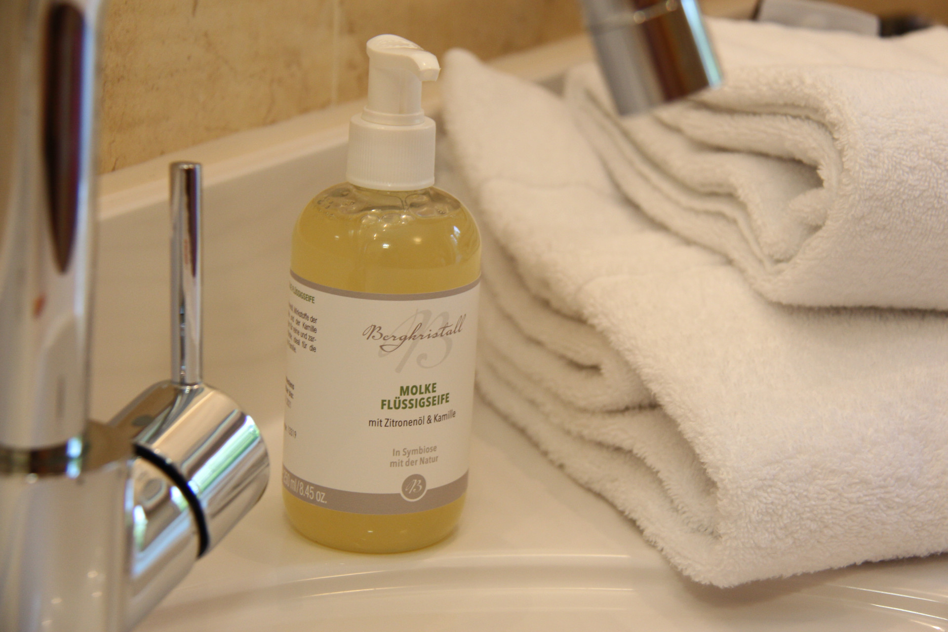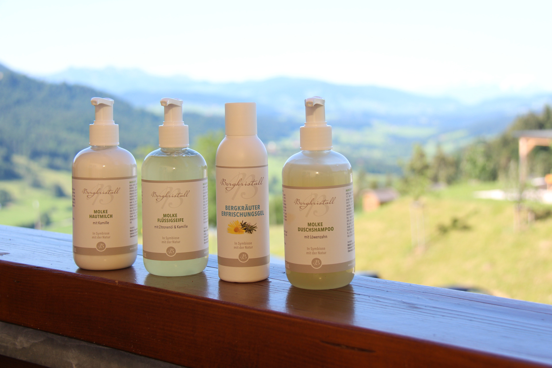 Die Pflegeserie, die nicht im Haus, sondern bei der Familie Metzler im österreichischen Egg produziert wird, enthält als Grundstoff hauptsächlich Molke. „Das trocknet die Haut nicht aus und unterstützt den natürlichen Schutzfilm. Kombiniert mit heimischen Alpenkräutern zeigen die Produkte, die überall im Haus zur Verfügung stehen, sogar bei empfindlichen Hauttypen eine fantastische Wirkung.“ Das Shampoo dazu stärkt Haare und Kopfhaut und sorgt für Glanz und Spannkraft.