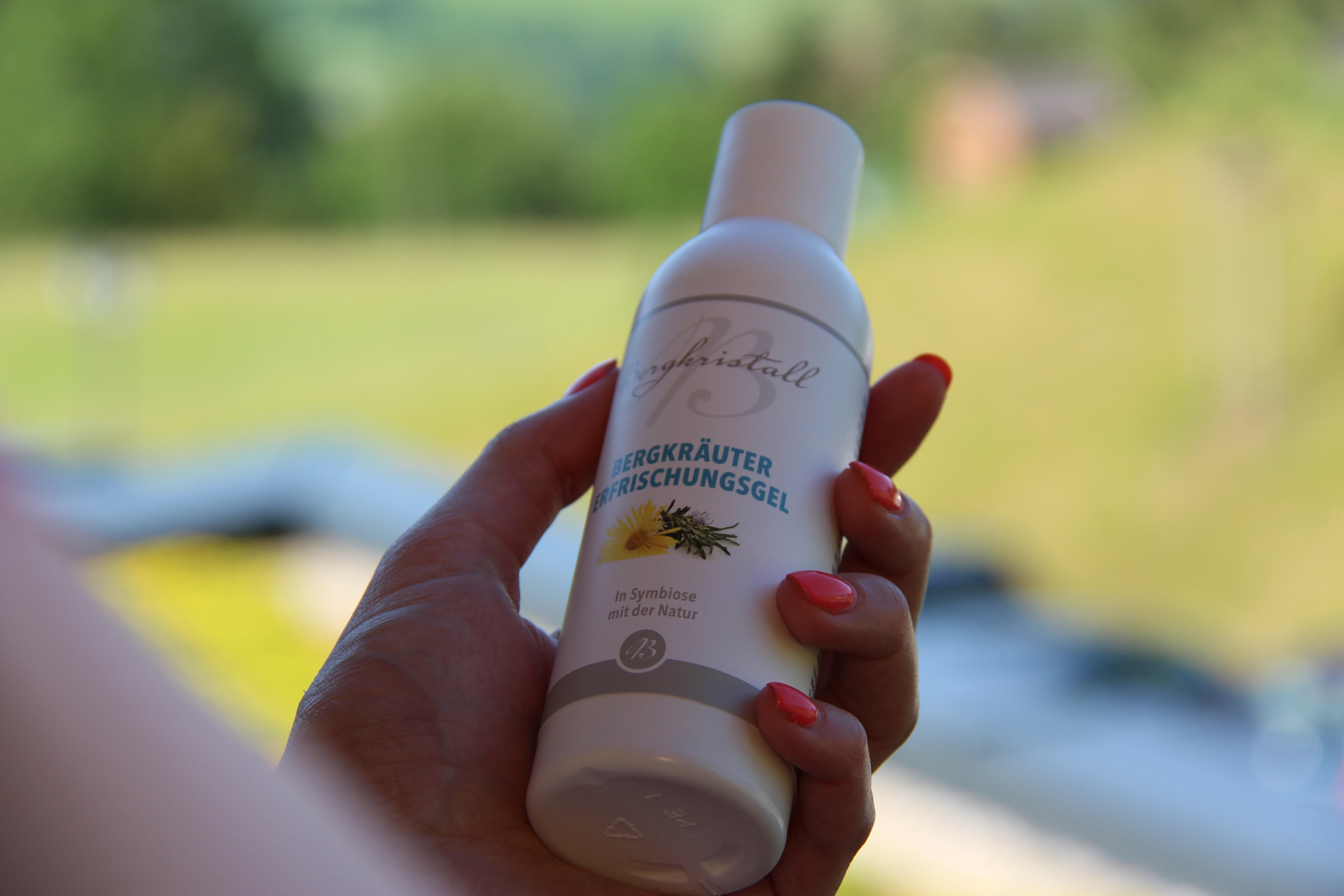 Das Bergkräuter-Erfrischungsgel soll munter machen. „Auf Schläfen, Stirn, Dekolletee und Nacken leicht auftragen, nicht einmassieren“ steht auf der Flasche. Ich trage leicht auf und bin schwer beeindruckt: Rosmarin, Arnika und Ringelblume verbreiten absolutes Wohlbefinden.