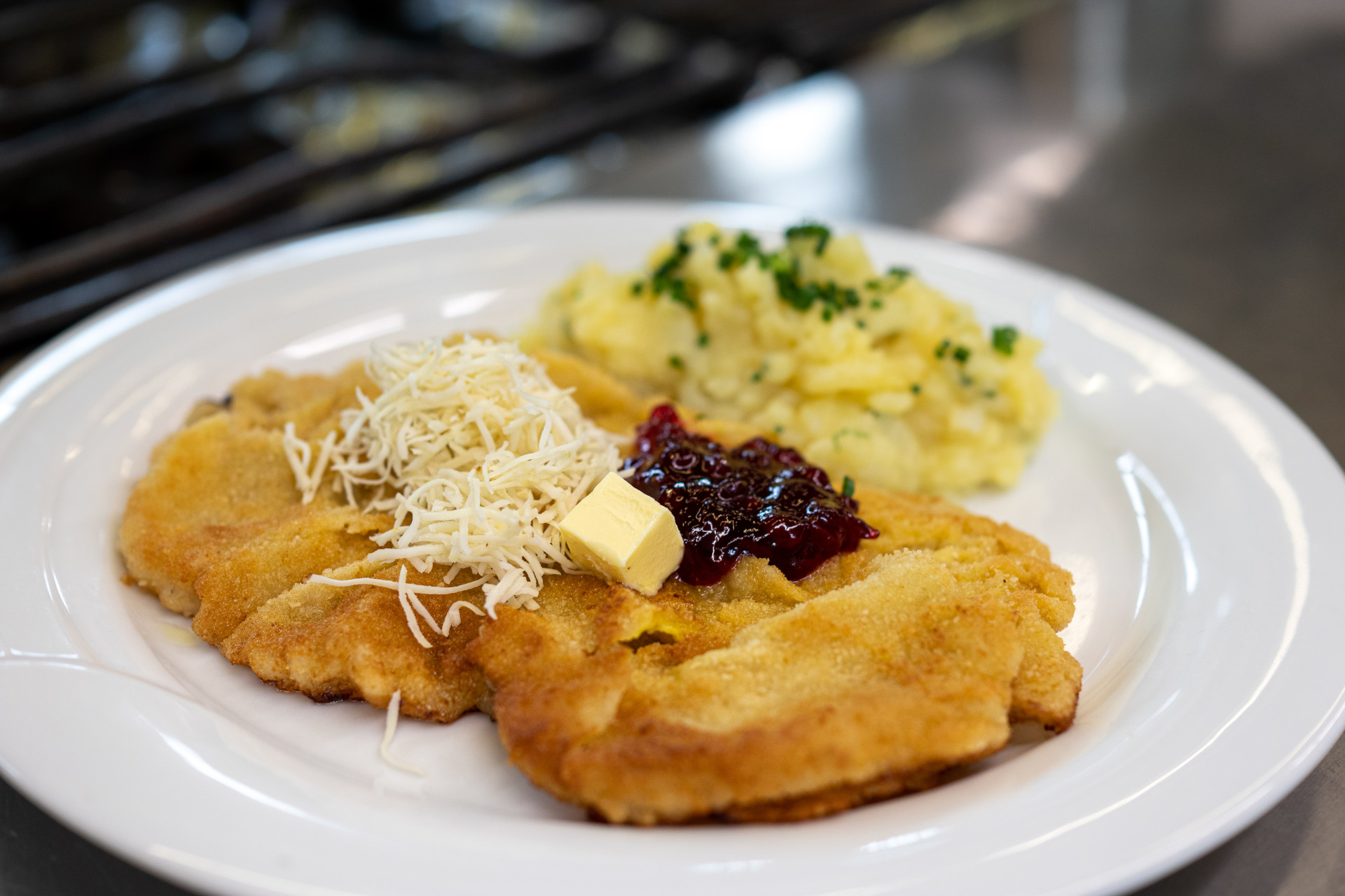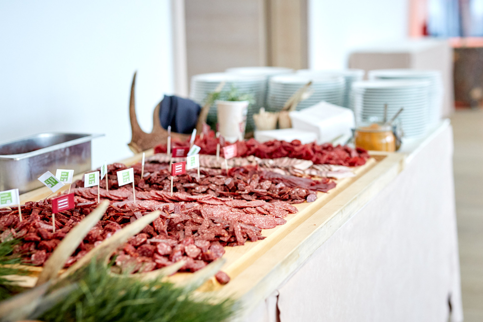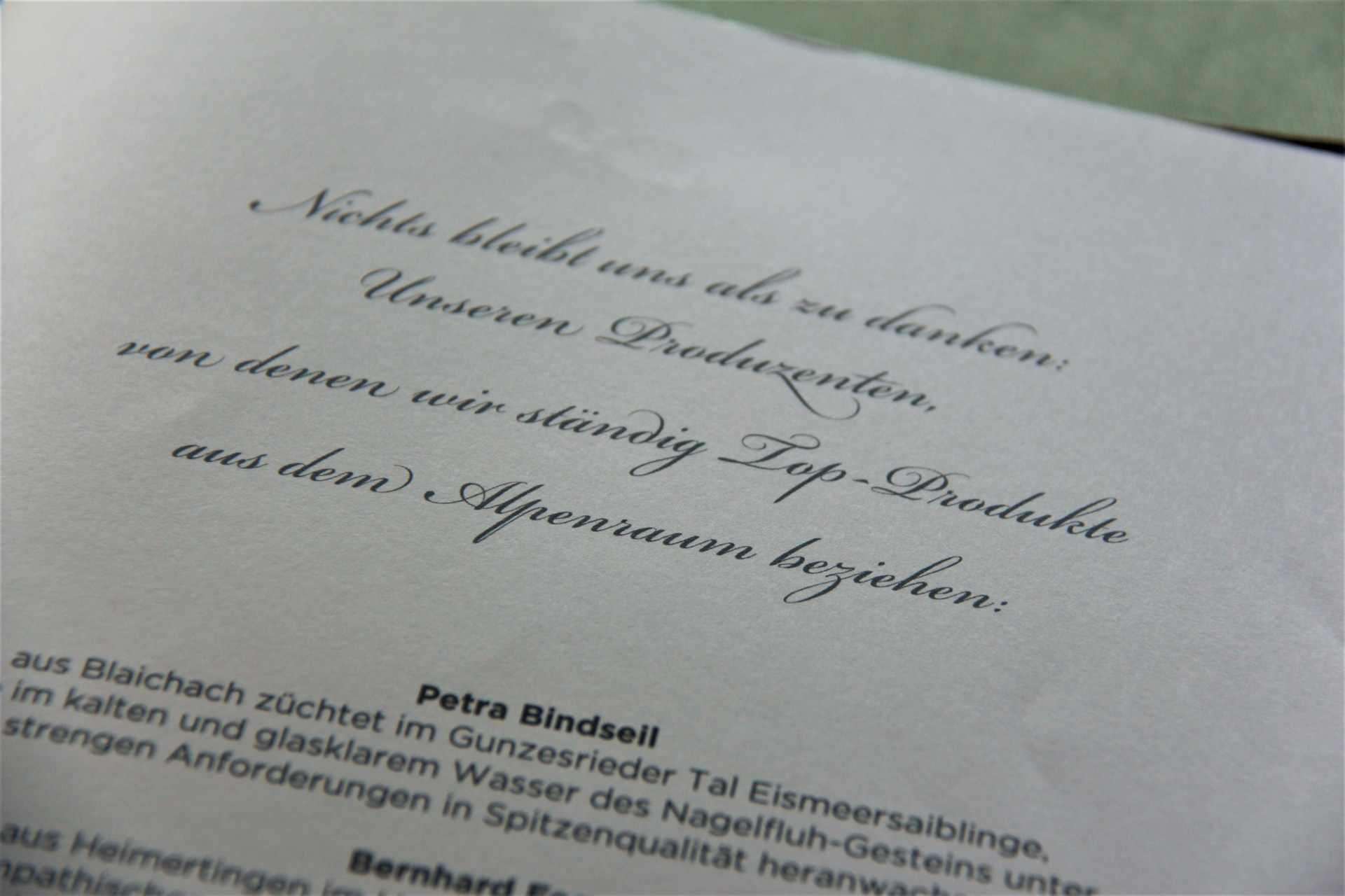 Auf der Karte klingt das am Ende so, als würden Bekannte die Produkte liefern: Wälderhennele der Familie Karu auf Wiesenkräuter-Rollgerste mit fruchtiger Paradeisersoße. Rosa gebratener Rücken vom Walser Hirschkalb mit Preiselbeeren. Ganz frisch vom Besitzer des „s’hirscheck“ – ein Jäger aus dem malerischen Dorf, das sich vom Terrassenblick aus in die Bergwelt erstreckt. „Wir reagieren sehr flexibel auf das, was uns angeboten wird und entwickeln auch langfristig gemeinsam neue und schmackhafte Produkte.“ Zum Beispiel die Hirschwurzen, die es unter anderem in der Jausen-Zeit gibt.