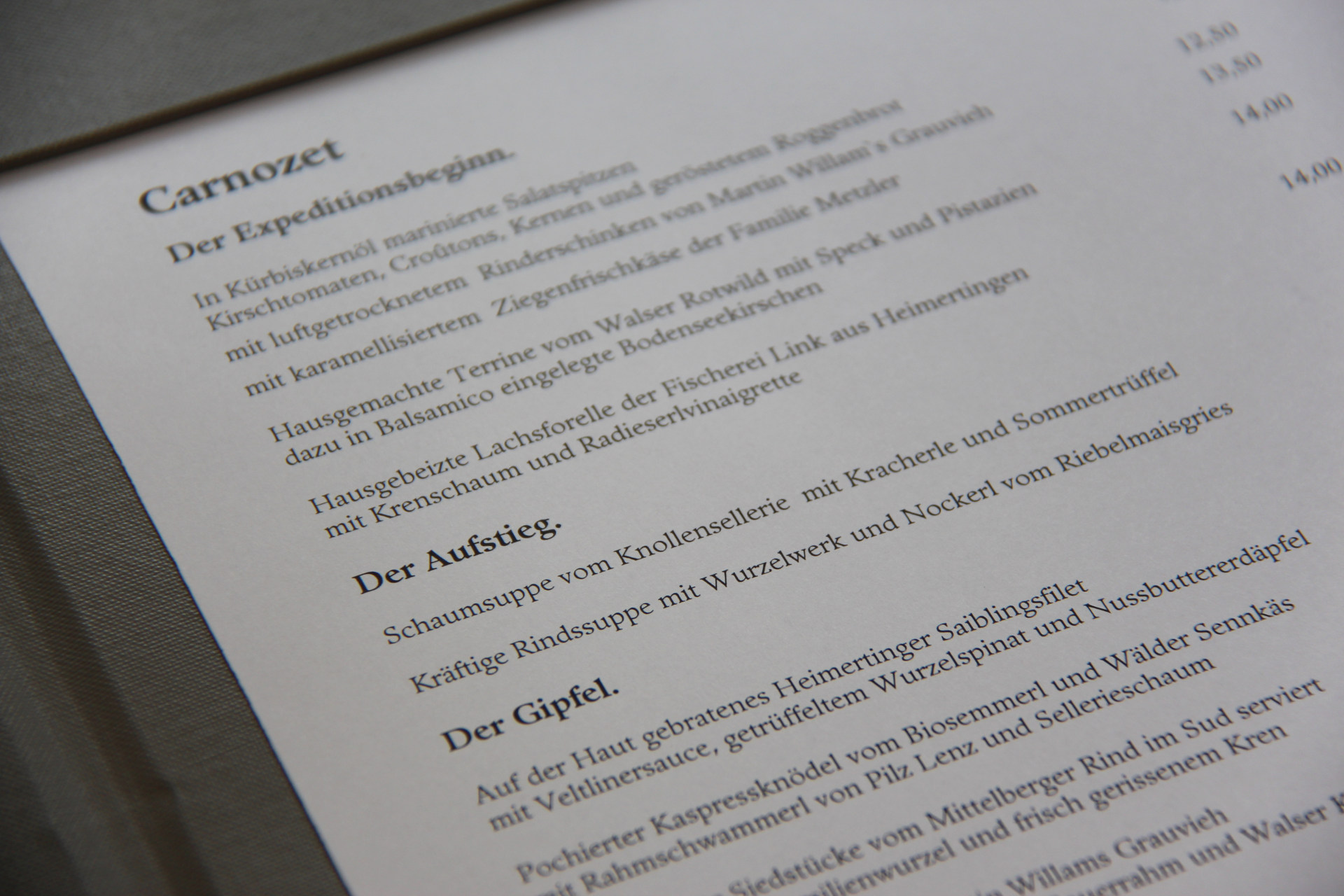 Mit dabei sind Wirtshausklassiker wie Tafelspitz, Wiener Schnitzel und Hirschgulasch. Die Zutaten dafür liefern Produzenten aus drei Regionen: dem Kleinwalsertal selbst, dem Bregenzer Wald und Partner aus dem Allgäu. Im „Carnozet“ treffen wohlig-ledrige Stühle und schwere Tische auf Schwarzstahl, sonnenverbranntes Fichten-Altholz und schwarz-weiße Fotos aus glanzvollen, historischen Zeiten. Das Essen, das auf den Teller kommt, ist so wie das Ambiente: ehrlich, authentisch, echt.
