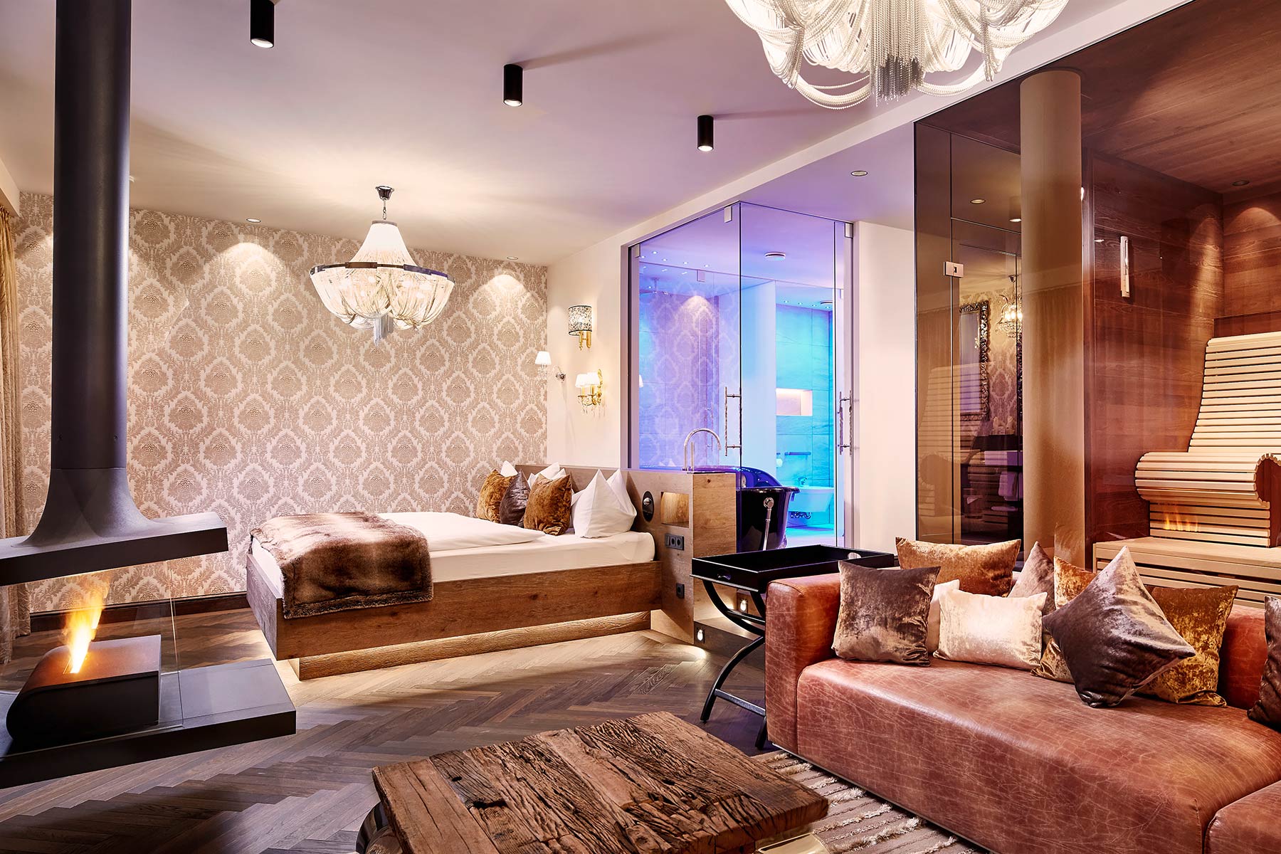 Abschalten. Die Seele baumeln lassen. Zeit verlieren, nicht gewinnen. Endlich mal Zeit zu zweit. Was für eine schöne Vorstellung! Die Zimmer, Chalets und Suiten in dem Adults-only-Resort sind die besten Tankstellen für Körper und Geist. Beispielsweise die Suite namens „… die Träumerei“: Hier entspannt man wahrlich königlich: mit Panorama-Badezimmer, Panorama-Sauna und Kaminfeuer…