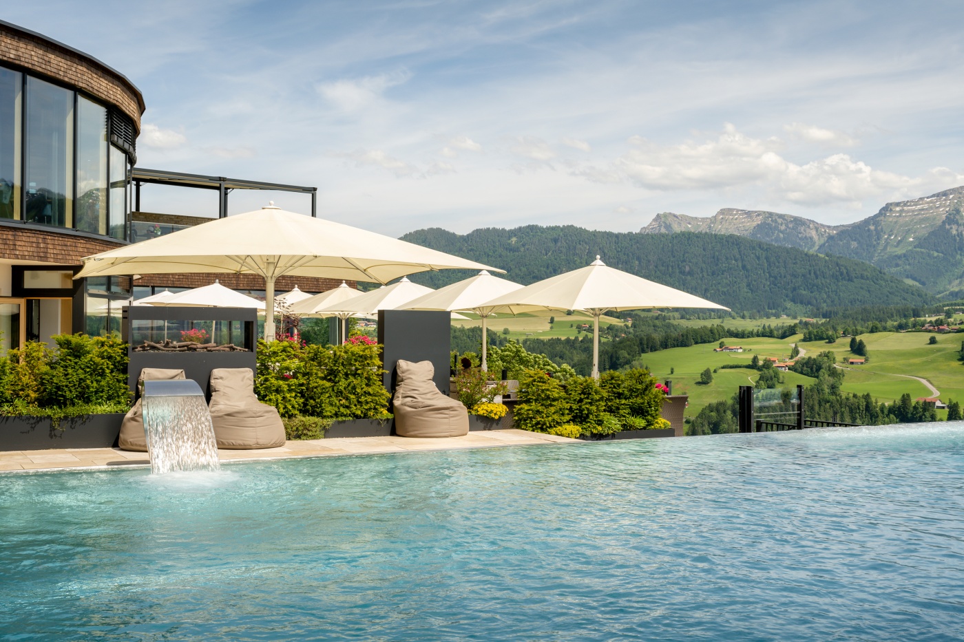 Die mutige Mischung aus Fernost und Allgäu gipfelt im alpinen Zen-Garten zwischen japanischen 37-Grad-warmen Onsen-Becken. Direkt hinter dem Naturbadeteich mit Bergquelle und der neuen Bergsauna: Braunvieh an einem richtig steilen Hang.