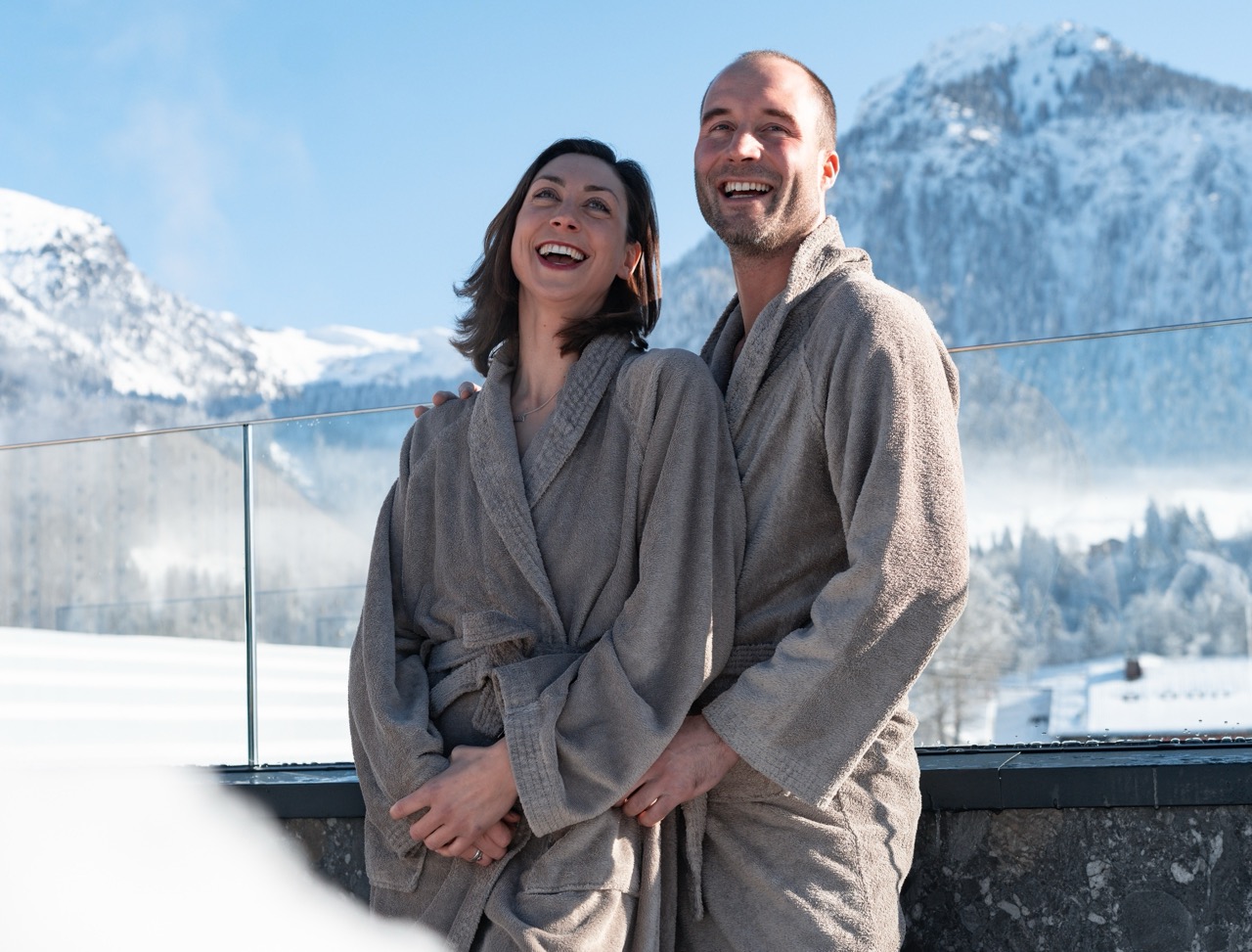 Ein Paar im Bademantel vor schneebedeckten Bergen im Hotel Franks in Oberstdorf.