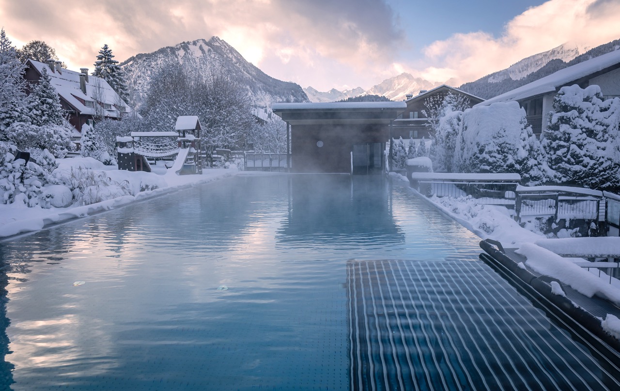 Blick auf den Außenpool im Winter im Hotel Franks in Oberstdorf.